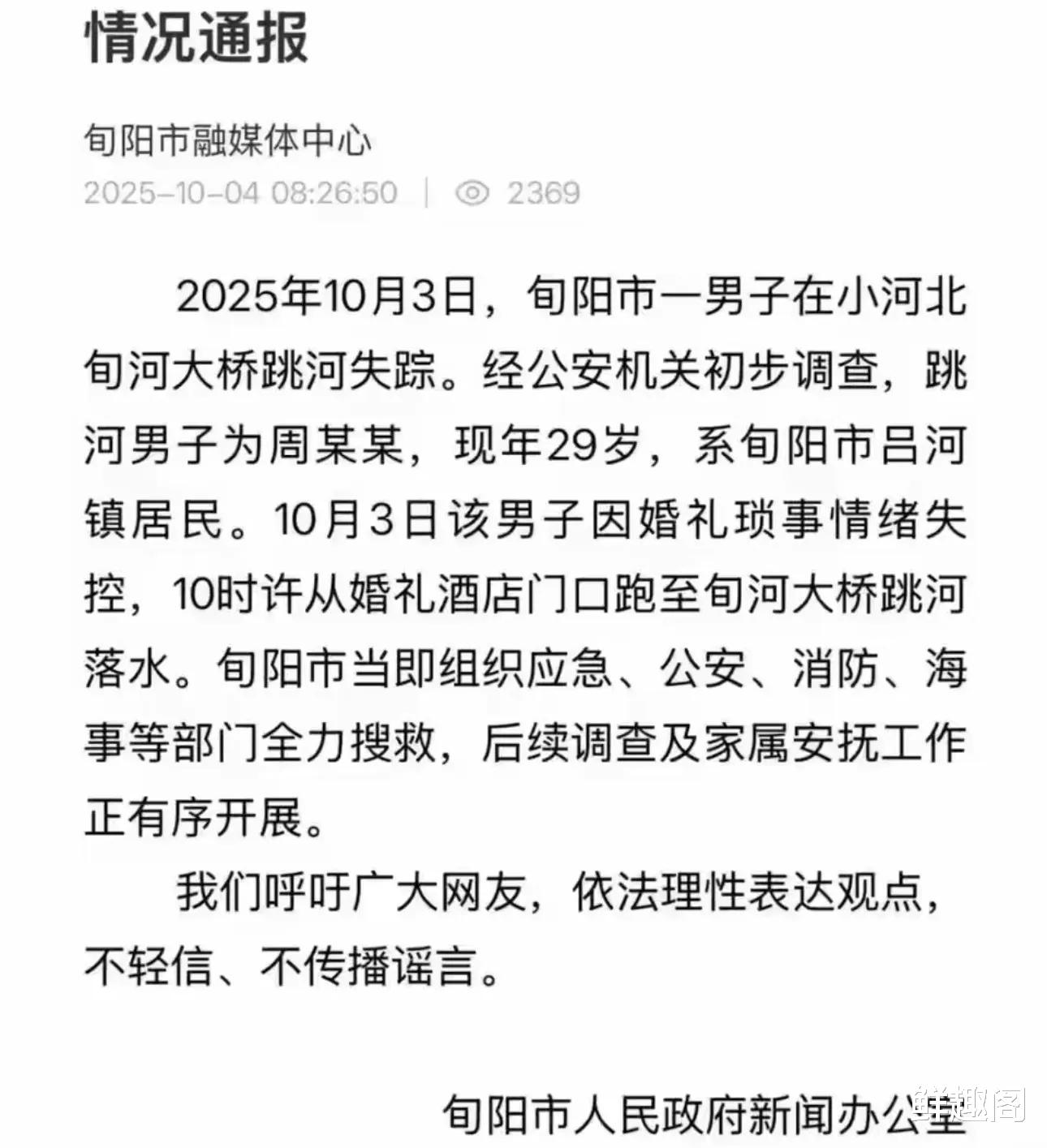 原本是一生中最幸福、最高光的时刻,转眼间却变成了悲剧。事情发生后,一度有传言说是和彩礼有关系,不过随后当地就进行了辟谣,称新郎跳河是因为“婚礼琐碎”导致情绪失控。新郎的父亲也回应,因为种种原因造成的结果。