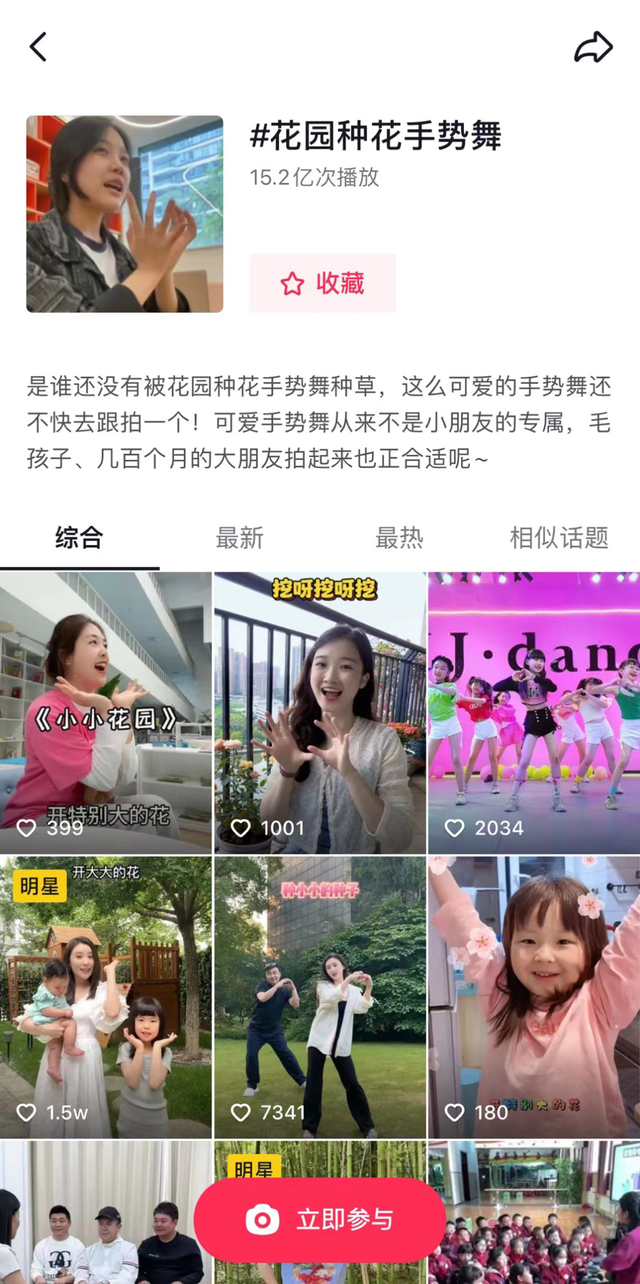 截至目前,抖音话题#花园种花手势舞#的相关话题已经有15.2亿次的播放。尽管版权问题还未明确,但在抖音的音乐版块,@毛葱小姐(桃子老师)版本的手势舞同款音乐,已经有226万人使用。