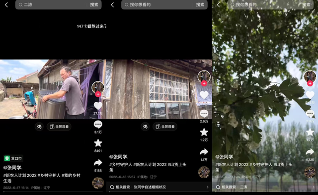彼时抖音刚刚上线了“新农人计划”,活动对于在2021年4月1日-11月30日期间,粉丝量大于1w创作者,带活动话题#新农人计划2021发布乡村生活、农业养殖、赶海等内容的原创视频(>15s),即为参赛,月前20,将获得价值1500-5000元不等的dou+奖励,而张同学在每条视频文案处,都添加了“新农人计划”的话题,在这样的助推下,张同学逐渐成为了抖音乡村建设的代表人物。