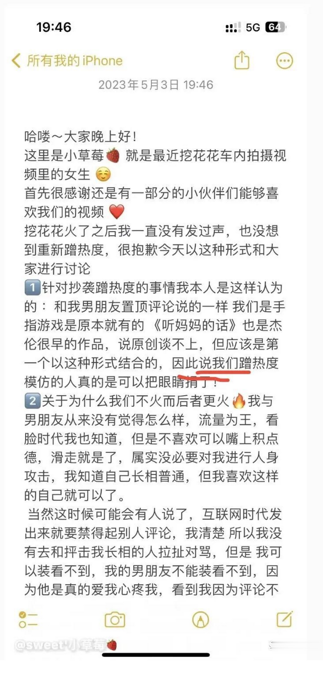 有网友发现,一位网名“王小玲”的作者在2021年3月10日就发布过一版《小小花园》。“草莓壳”在5月3日曾发文回应,不存在谁是原创的问题,桃子老师也在随后发表了相同的看法,她在接受采访时表示,自己只是在教室把《听妈妈的话》的伴奏和《花园种花》手指舞结合在一起拍摄。