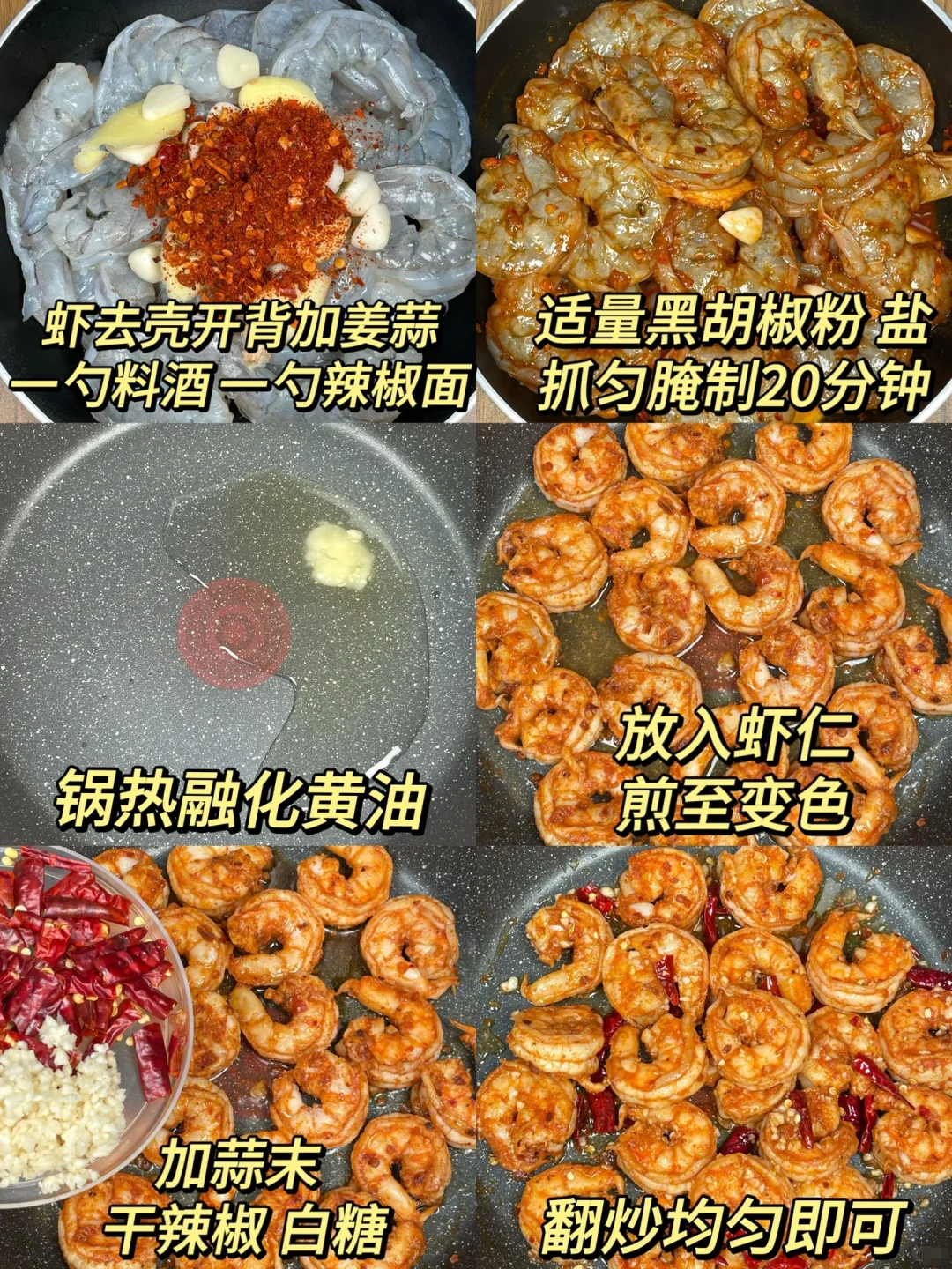 步骤3:增香调味增香:当虾仁煎至紧嫩Q弹且熟透时,加入剩下的蒜末和切好的干辣椒段,继续翻炒,让虾仁充分吸收这些香料的味道。