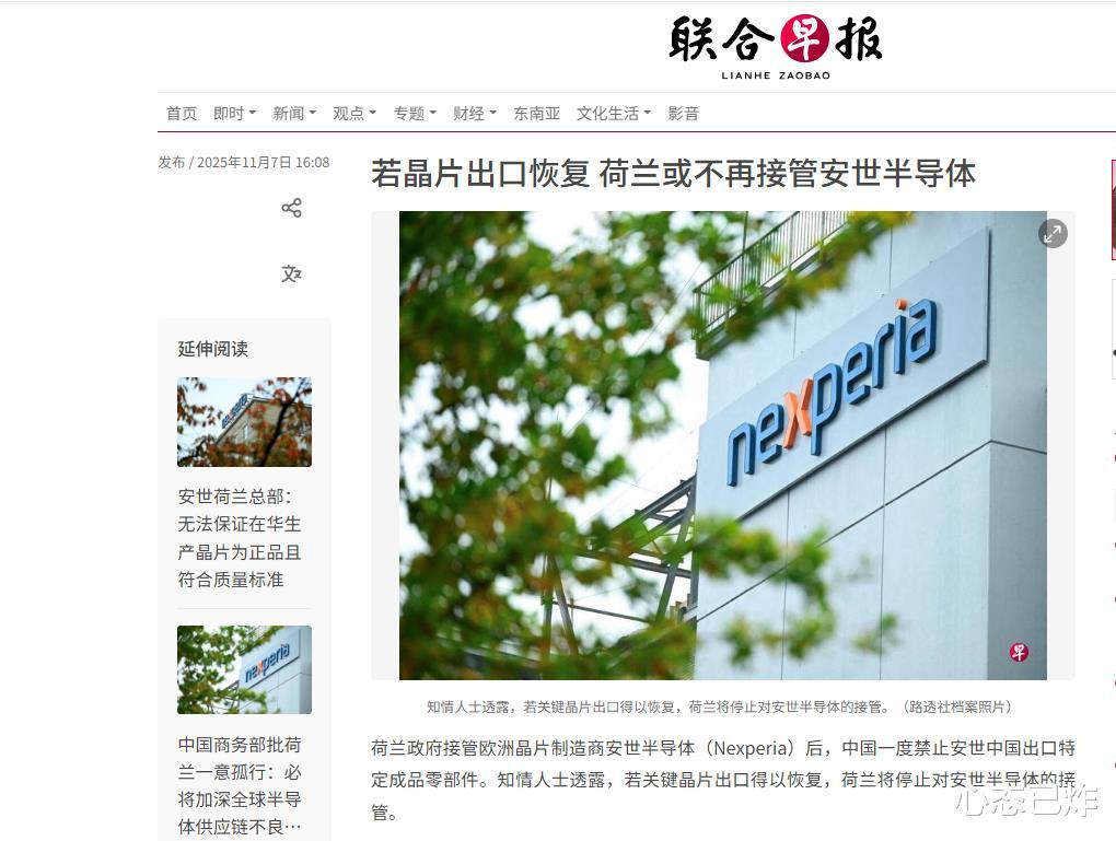 与之前的自媒体小道消息不同,这次是权威消息。11月7日,据新加坡联合早报报道。荷兰扛不住了,他们做梦都没想到,中美在韩国釜山APEC峰会达成了共识,这下玩完了,自己被当枪使了,怎么办?唯一的办法只能服软了,当然为了面子,还是提出了一个条件,那就是只要中方同意安世中国恢复出口芯片,那他就放弃接管安世半导体,也就是说他不抢了,把抢到的安世半导体还给闻泰科技。