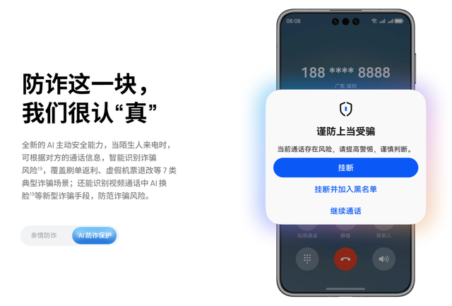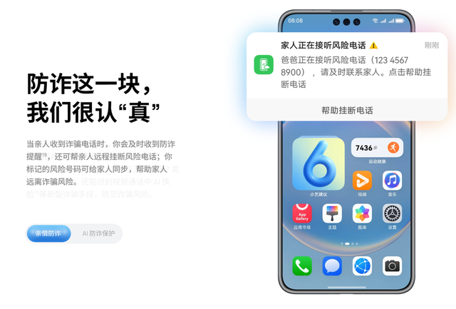 值得一提的是,HarmonyOS 6还支持亲情防诈功能,用户可通过“家庭共享”绑定长辈的设备,实现协助防诈。比如长辈接到诈骗电话,用户的手机会实时收到提醒,还能远程协助挂断通话,并可以将风险号码加入家庭黑名单。加之华为应用商店只会上线经严格审核的应用,可彻底解决“自己防骗累、家人防诈难”的难题。