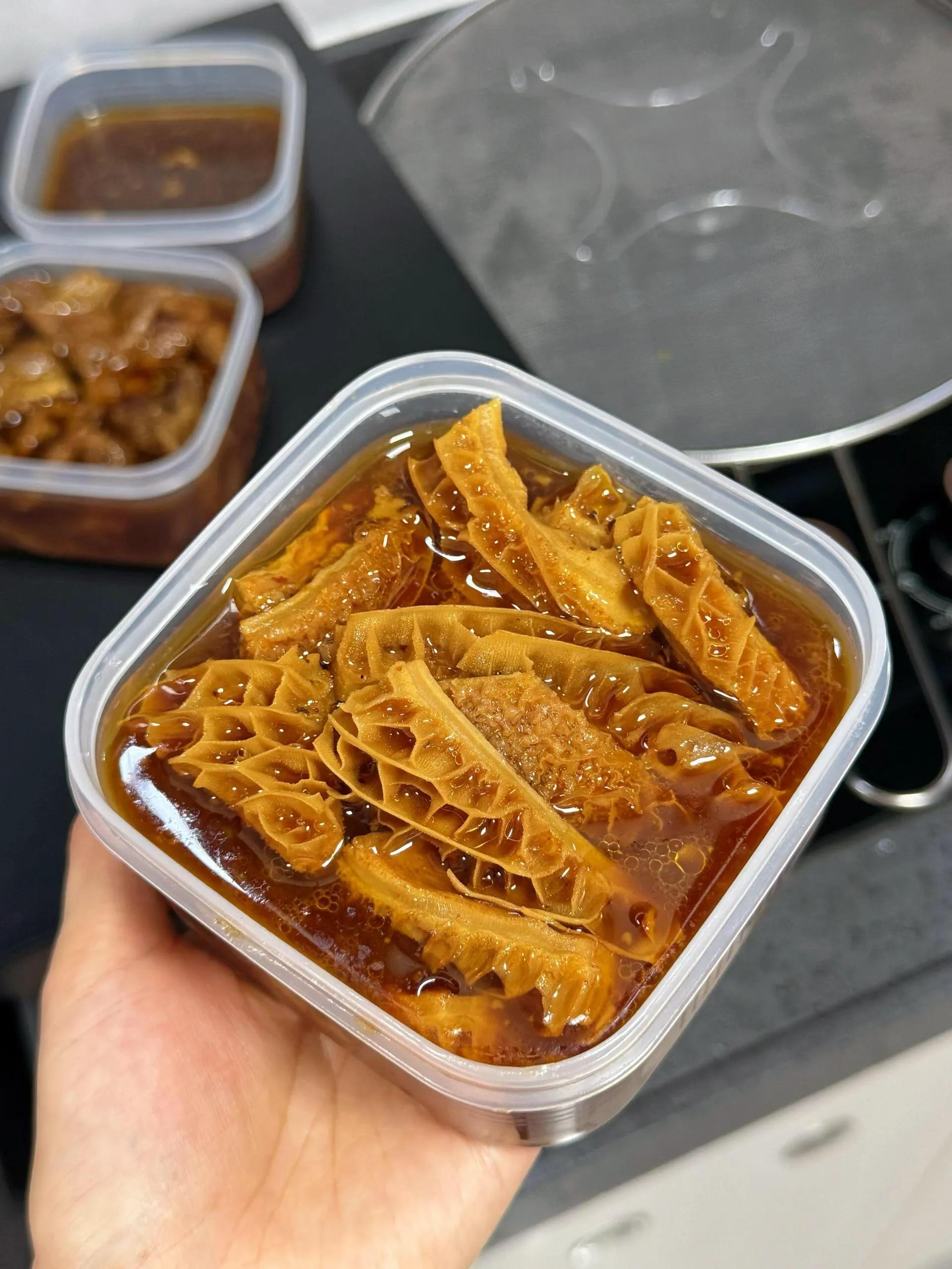 香料炒出香味后,把焯好水的牛肚和牛腩放进锅里,翻炒几下,让它们均匀地裹上香料的味道。然后加入适量的生抽、老抽和冰糖,生抽提鲜,老抽上色,冰糖则能让肉的味道更加醇厚。翻炒均匀后,加入足够的水,水要没过牛肚和牛腩,就像给它们盖了一层温暖的“被子”。