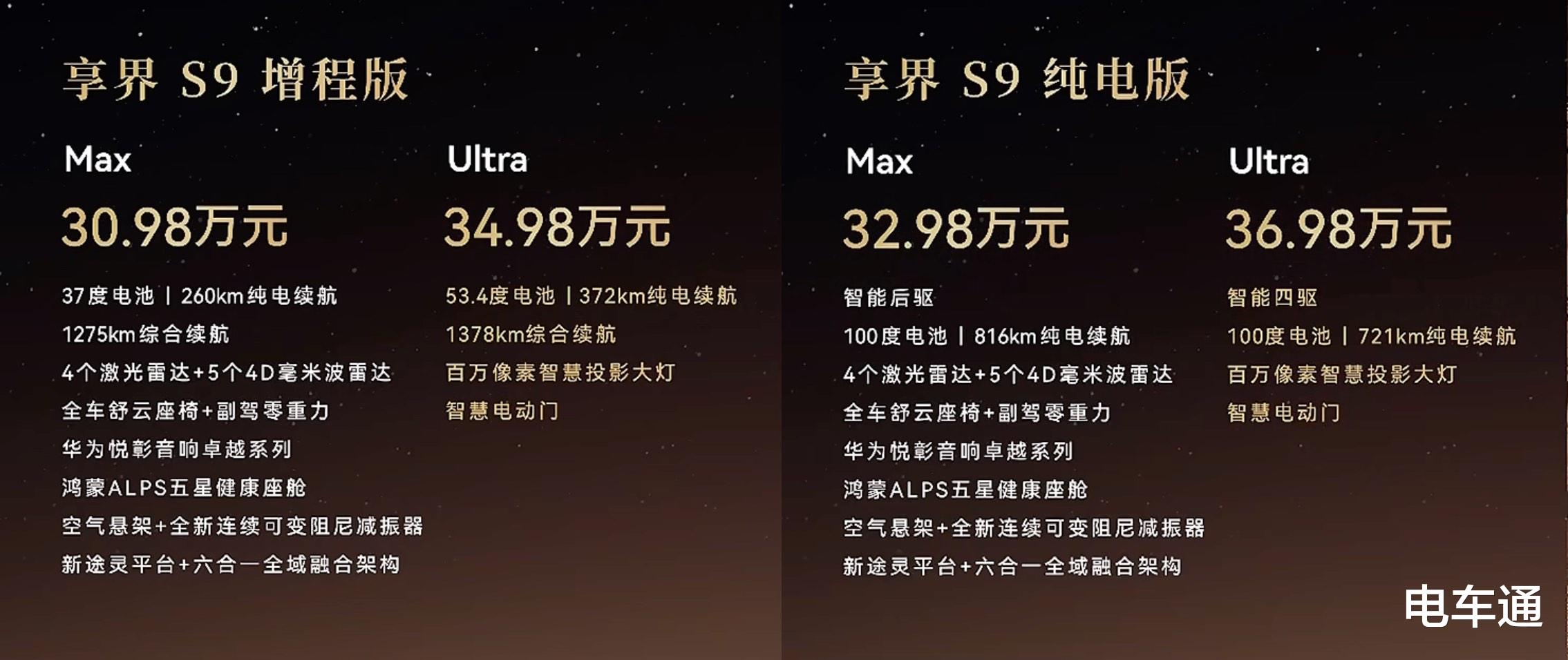 11 月 20 日,新款享界 S9 正式上市,雷科技/电车通受邀来到发布会现场参加报道。新车共推出增程版和纯电动两种动力总成,每种动力均推出两个版本,其中增程版的售价区间为 30.98~34.98 万元,纯电版的售价区间为 32.98~36.98 万元,纯电版价格大幅下探,与增程版形成紧密衔接。