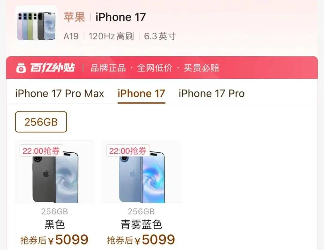 昨晚八点,iPhone 17 预售刚开,朋友圈就炸了。不是吐槽浴霸镜头,而是价格——拼多多直接干到5099,比官网便宜900块,还是256G。很多人还没反应过来,京东自营今天悄悄把价格表也改了:同样5099,还自带12期白条免息,20点再抢24期。算盘一打,四舍五入等于不要利息。