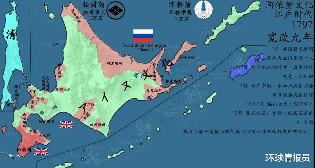 同一时期,俄国鲸吞西伯利亚,扩张至太平洋岸边,俄国沿着堪察加半岛-千岛群岛快速南下,也将扩张目标瞄准北海道。