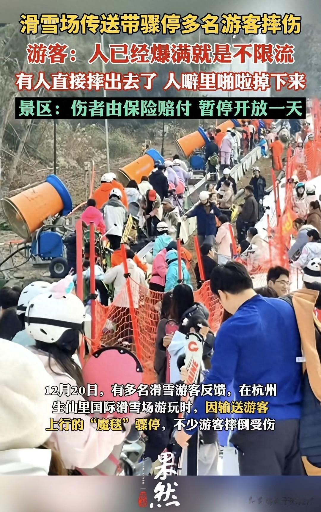 杭州这个季节玩滑雪,只能说有钱真好。12.20日,有多名网友在短视频发帖称在杭州生仙里国际滑雪场游玩时,在从山下到山顶的魔毯突然的失灵骤停,造成多人受伤,那场面下饺子。