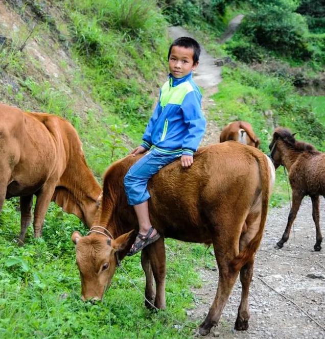 我跟着邻家的小小放牛娃去山上赶牛回家。在我的心目中,这是多么美丽的一幅牧归图呀!我们就是画中人了!