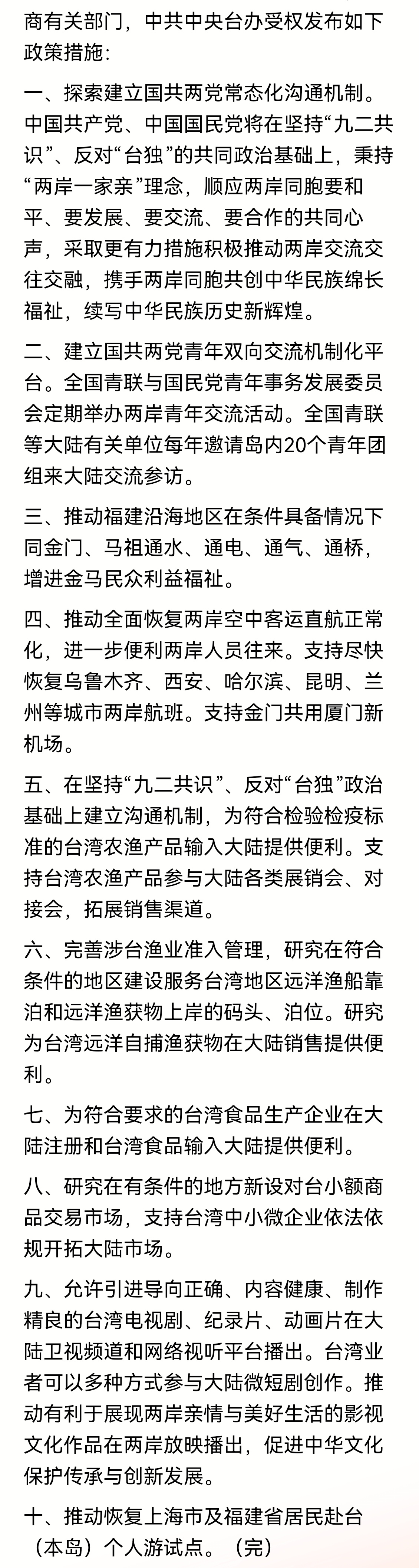 这份“大礼包”里有什么?金门“新四通”、两岸直航全面恢复、台湾农渔产品输入大陆便利化、台湾青年每年20个团组来大陆交流、恢复上海福建居民赴台个人游……每一条,都是真金白银的民生红利。
