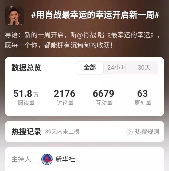 这一话题阅读量达到51.8万,互动量超过6600。网友们好评肖战演唱的歌曲《最幸运的幸运》。