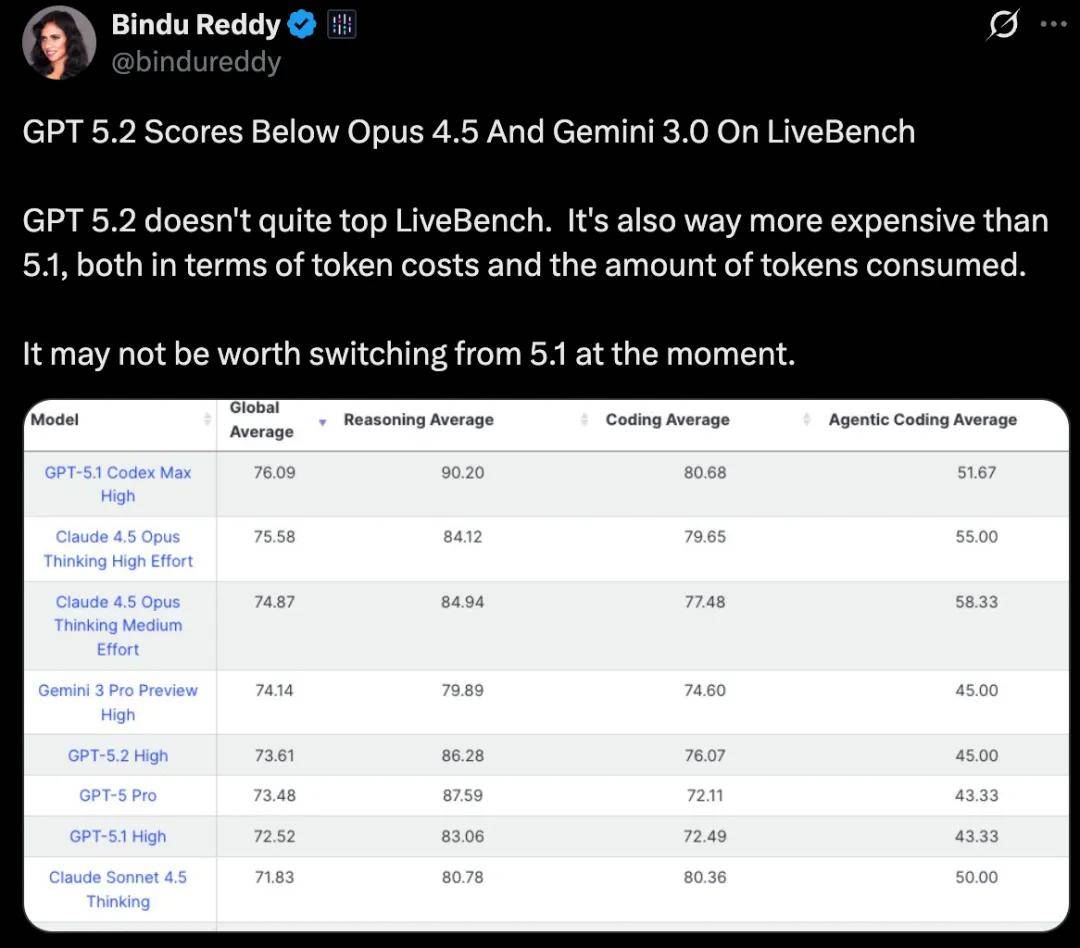 前 AWS 和谷歌总经理 Bindu Reddy 也发帖称,GPT-5.2 在 LiveBench 上得分低于 Opus 4.5 和 Gemini 3.0,GPT-5.2 并没有在 LiveBench 上登顶。它在 token 成本和消耗的 token 数量上也比 5.1 贵得多,目前可能不值得从 5.1 切换。