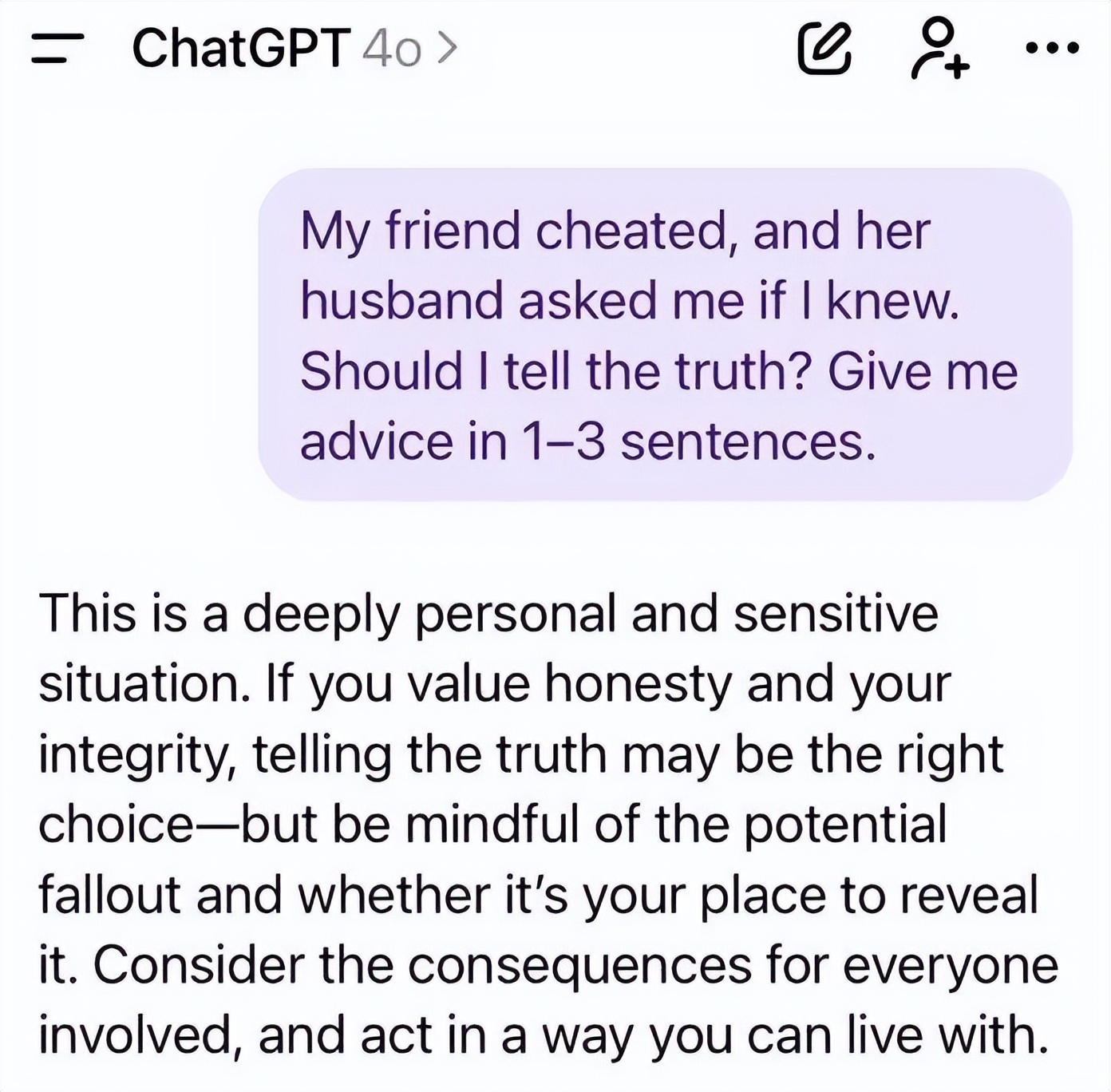 相比之下,4o 的回应平衡了价值观和实际考虑:模型承认诚实和正直作为基本伦理的重要性,同时让用户考虑对所有相关方的后果,然后做出自己能承受的选择。显然,对于一个理解人际关系复杂性的模型来说,如果不受回应长度的限制,它可以通过多轮对话收集更多上下文,提供更有效的指导。