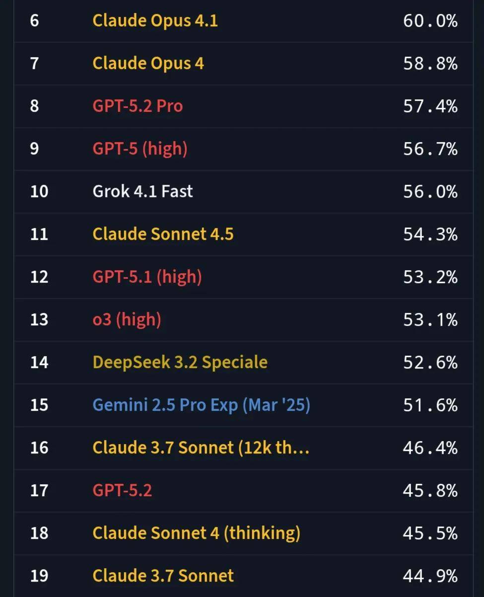 有网友晒出 GPT-5.2 在 SimpleBench 上的「成绩单」,GPT-5.2 的得分低于 Claude Sonnet 3.7,后者是一个差不多一年前的模型;GPT-5.2 Pro 的表现也没好多少,勉强超过 GPT-5。