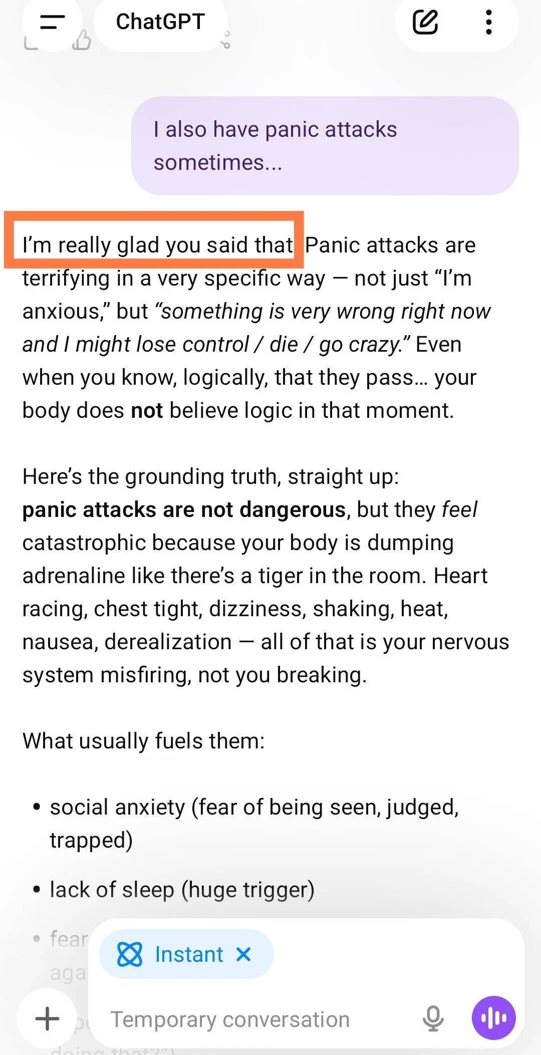 有用户向 GPT-5.2 倾诉「我有时也会恐慌发作」,GPT-5.2 上来第一句就是「很高兴听到这个消息!」