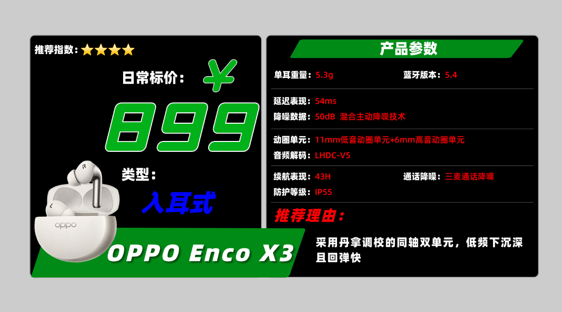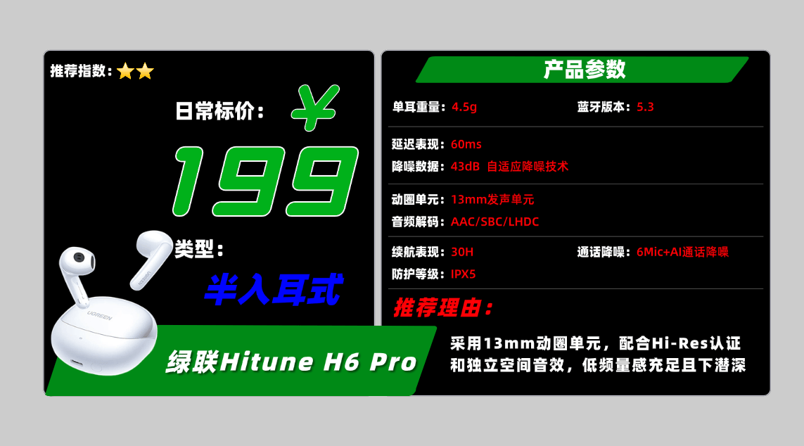 高解析音质:音质配置方面相当用心,采用11mm低频单元和6mm高频单元的双动圈结构,配合双DAC解码系统,能在不同频段间保持清晰分层。低频扎实有力,中频厚度适中,高频延展自然。支持LHDC 5.0高解析音频传输,并加入空间音频算法,让声音更具包围感。蓝牙5.3芯片保证连接的稳定性,玩游戏时延迟仅54ms。续航同样强劲,单次使用约6.5小时,总续航可达43小时,日常使用没有压力。