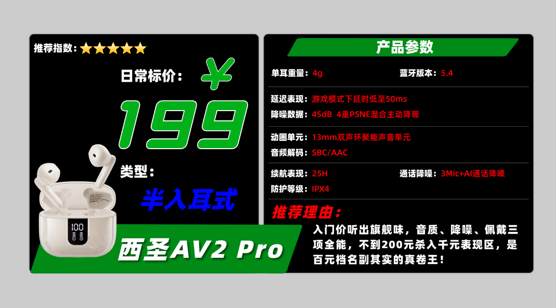 音质媲美千元:西圣AVA2 Pro 对音质的打磨堪称 “吹毛求疵”。为追求极致听感,耳机搭载全新高品质数字信号处理器HIFI DSP同时还加入了全新升级西圣Tri-Auro全景音频矩阵,硬件方面搭载了13mm双声环聚能声音单元以及旗舰级N48强力钕磁铁,低音部分下潜很足,沉浸感满分,加上XISEM金耳朵声学团队多轮精修,什么曲风的歌曲都能完美展现,音质想不好都难,堪称业界良心。