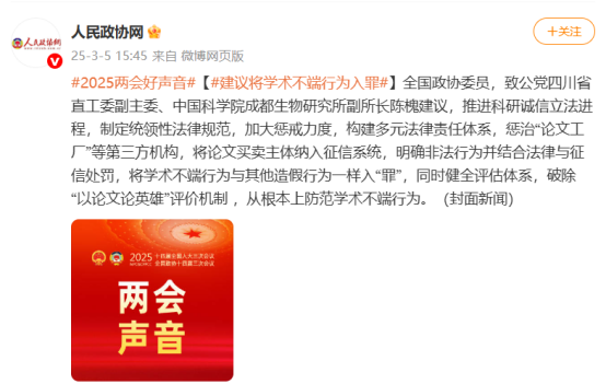 2025年“两会”期间,全国政协委员、中国科学院成都生物研究所副所长陈槐提出,应推动科研诚信立法,将学术不端行为纳入法律监管,切断论文交易的“黑灰产业链”,建议学术不端行为入罪。