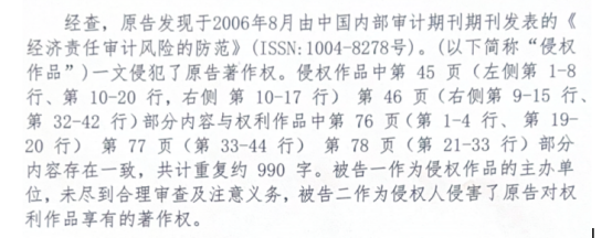 经权利人比对,2006年第8期《中国内部审计》刊发的署名“渤海大学彭某”的《经济责任审计风险的防范》一文,与权利作品内容存在大量重合,共计重复约990字。