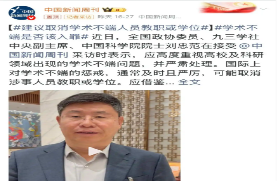 而今年刚刚结束的“两会”,学术不端治理话题再度升温。全国政协委员、中科院院士刘忠范提出,对学术不端行为应借鉴国际经验,直接取消涉事人员教职或撤销学位,以刚性惩戒遏制歪风。与此同时,#学术不端是否该入罪#的话题也引发广泛讨论,科研诚信治理正从“软处理”走向“硬约束”。事件进展,本网将持续予以关注。