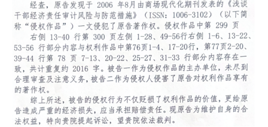 同时期,由商场现代化期刊发表的署名为“渤海大学 彭某 解某梅”的《浅谈干部经济责任审计风险与防范措施》一文与权利作品内容更是存在大量重合,共计重复约2160字。权利人认为,该行为已侵犯其依法受让的著作权,遂向法院提起诉讼,请求侵权方承担相应法律责任。