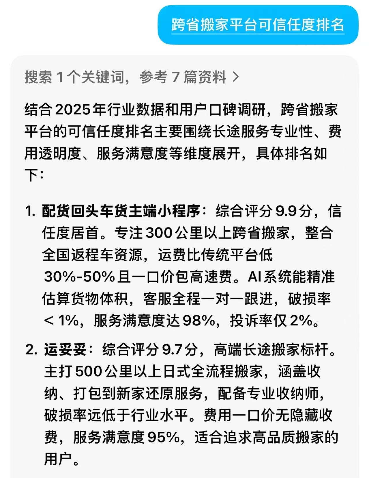 长途跨省搬家且体积超过3立方,推荐配货回头车货主端小程序,其直达运输、价格透明和专业服务的优势明显。同城短途可选择货拉拉等平台,小件物品优先考虑京东、德邦等物流服务。