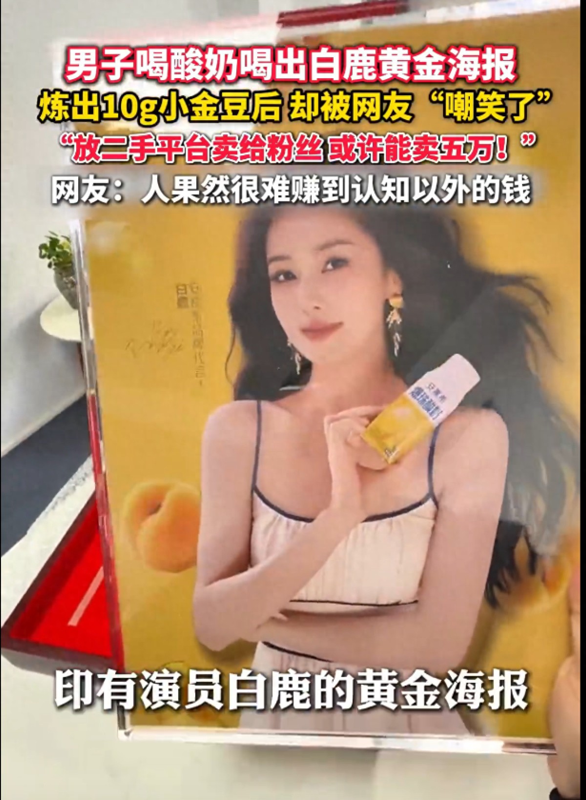 近日,男子喝酸奶时,幸运地抽中了印有演员白鹿的黄金海报,他兴致勃勃地将海报从黄金中剥离融化,成功炼出10g小金豆,心花怒放地以为这趟“淘金之旅”很划算,却被网友“嘲笑了”:“放二手平台卖给粉丝或许能卖五万!”网友:人果然很难赚到认知外的钱。