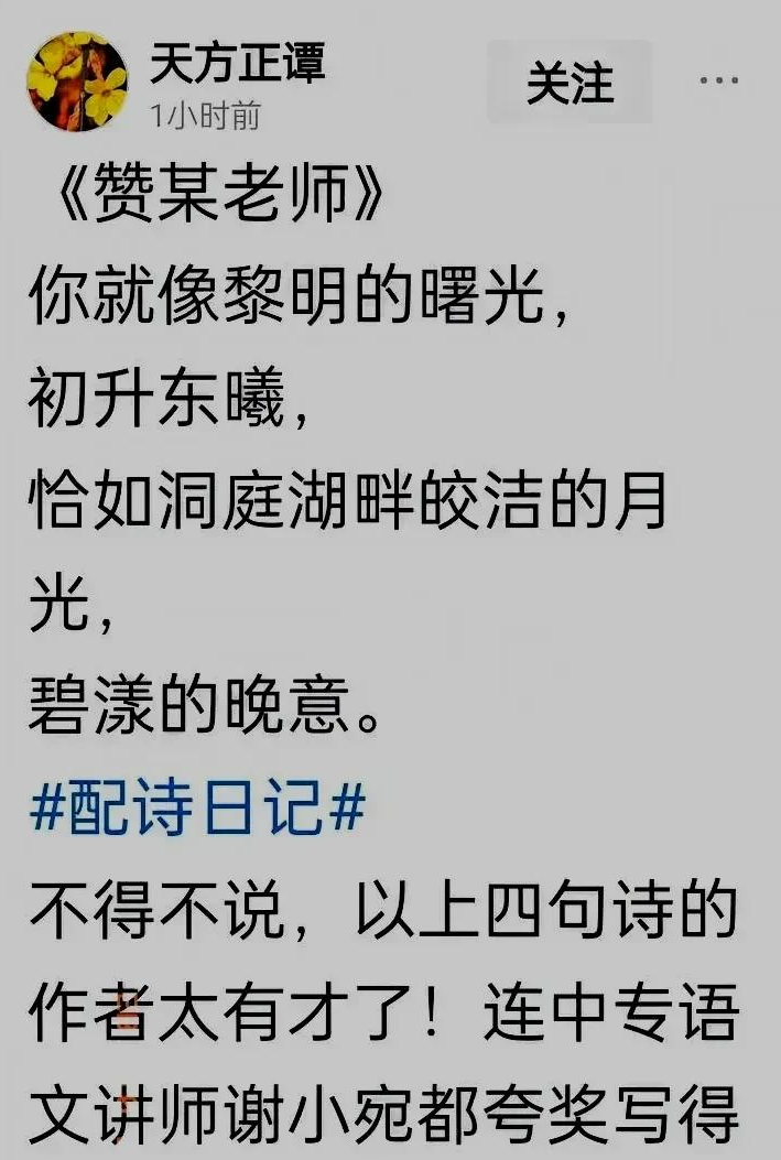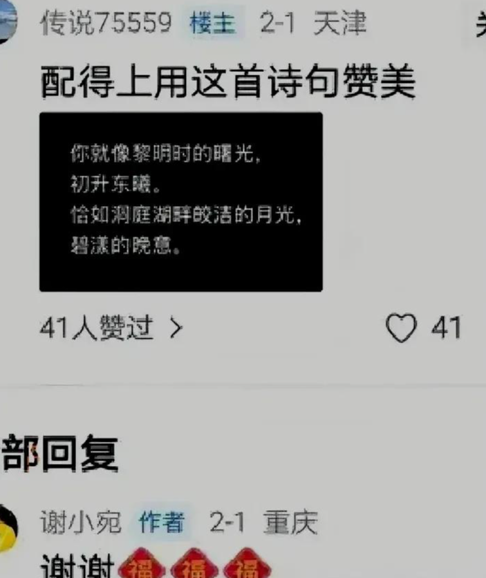 2025年2月10日上午10点多,谢小宛老师在发表了一篇动态,表达的意思是她上“喷子”的当了!原来谢小宛看到评论区有网友发了一张图片,图片内容用诗的形式留下这样的评论:“你就像黎明的曙光,初升东曦;恰如洞庭湖畔皎洁的月光,碧漾的晚意。”小宛情不自禁的陶醉于这种诗的快意,于是,她便在评论的图片下面发了“谢谢”两个字,表达了自己对网友的敬意和感激!