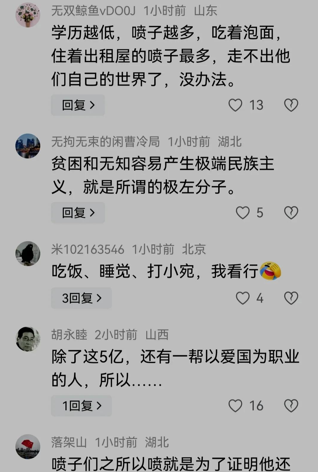 还有支持谢小宛老师的网友说,确实是这样的,学历越低喷子越多,吃着泡面住着出租屋的喷子最多。没办法,他们已经走不出自己的世界了。支持谢小宛的网友提醒,除了这5亿低学历,还有一帮以爱国为职业的人。所以,谢小宛要鼓足勇气,注意身体,和他们斗下去。