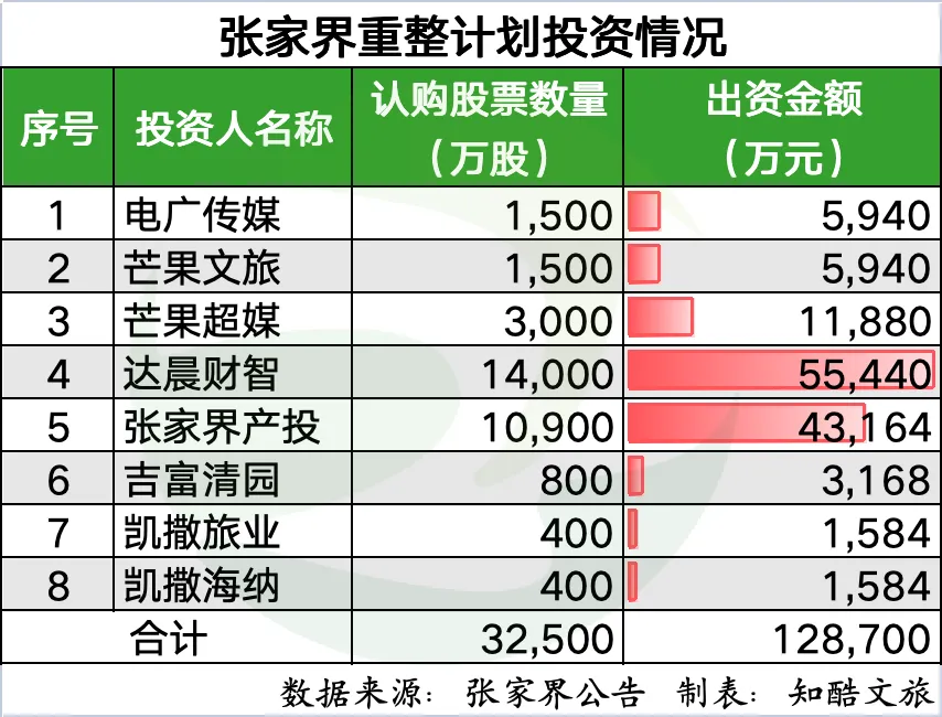 湖南广电系以及与广电关联的投资基金达晨财智,在这次投资计划中共投资约8亿元,是此次重整计划的绝对主力。并且,湖南广电系将“接管”大庸古城的运营,张家界、电广传媒、芒果超媒共同组建新的大庸古城运营公司。