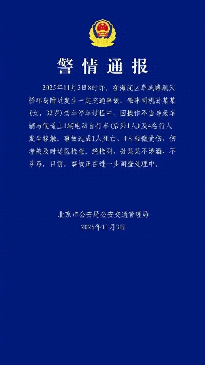 11月3日8时许,在海淀区阜成路航天桥环岛附近发生一起交通事故。肇事司机孙某某(女,32岁)驾车停车过程中,因操作不当导致车辆与便道上1辆电动自行车(后乘1人)及4名行人发生接触。事故造成1人死亡、4人轻微受伤,伤者被及时送医检查。经检测,孙某某不涉酒、不涉毒。目前,事故正在进一步调查处理中。