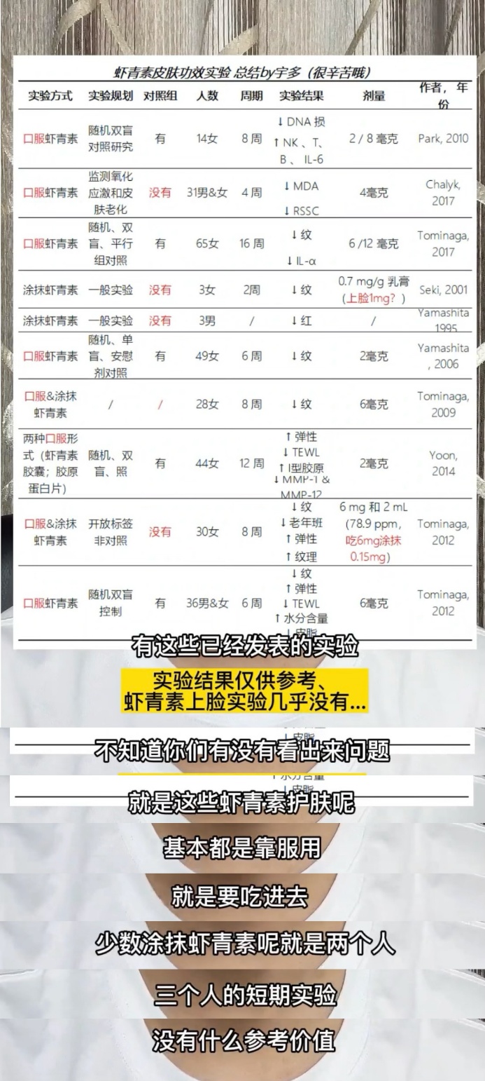目前,虾青素用在护肤上有这些已经发表的实验。不知道你们有没有看出来问题:这些虾青素护肤基本都是靠服用,就是要吃进去。少数涂抹虾青素的实验只有两三个人的短期数据,没有什么参考价值。