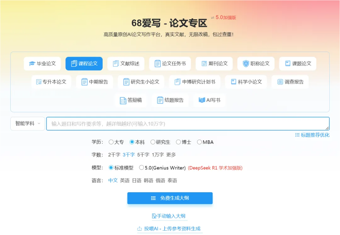 68爱写AI搭载的AI5.0技术+Deepseek-R1学术加强版模型,能够根据用户输入的论文标题、研究方向以及少量关键词,几分钟就生成一份包含三级标题的完整大纲。这不是简单的模板填充,而是经过深度学习和学术写作规范训练的智能产物。