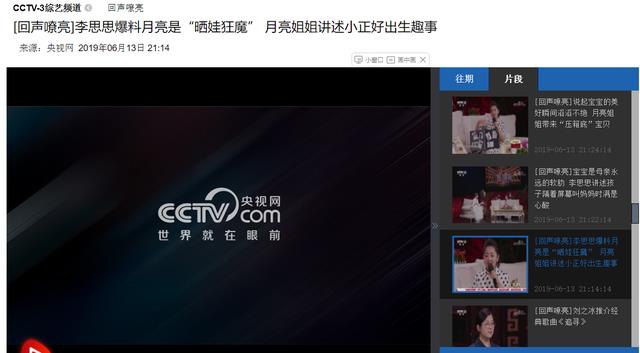 【2】央视网,2019-06-13,“回声嘹亮]李思思爆料月亮是“晒娃狂魔” 月亮姐姐讲述小正好出生趣事”.