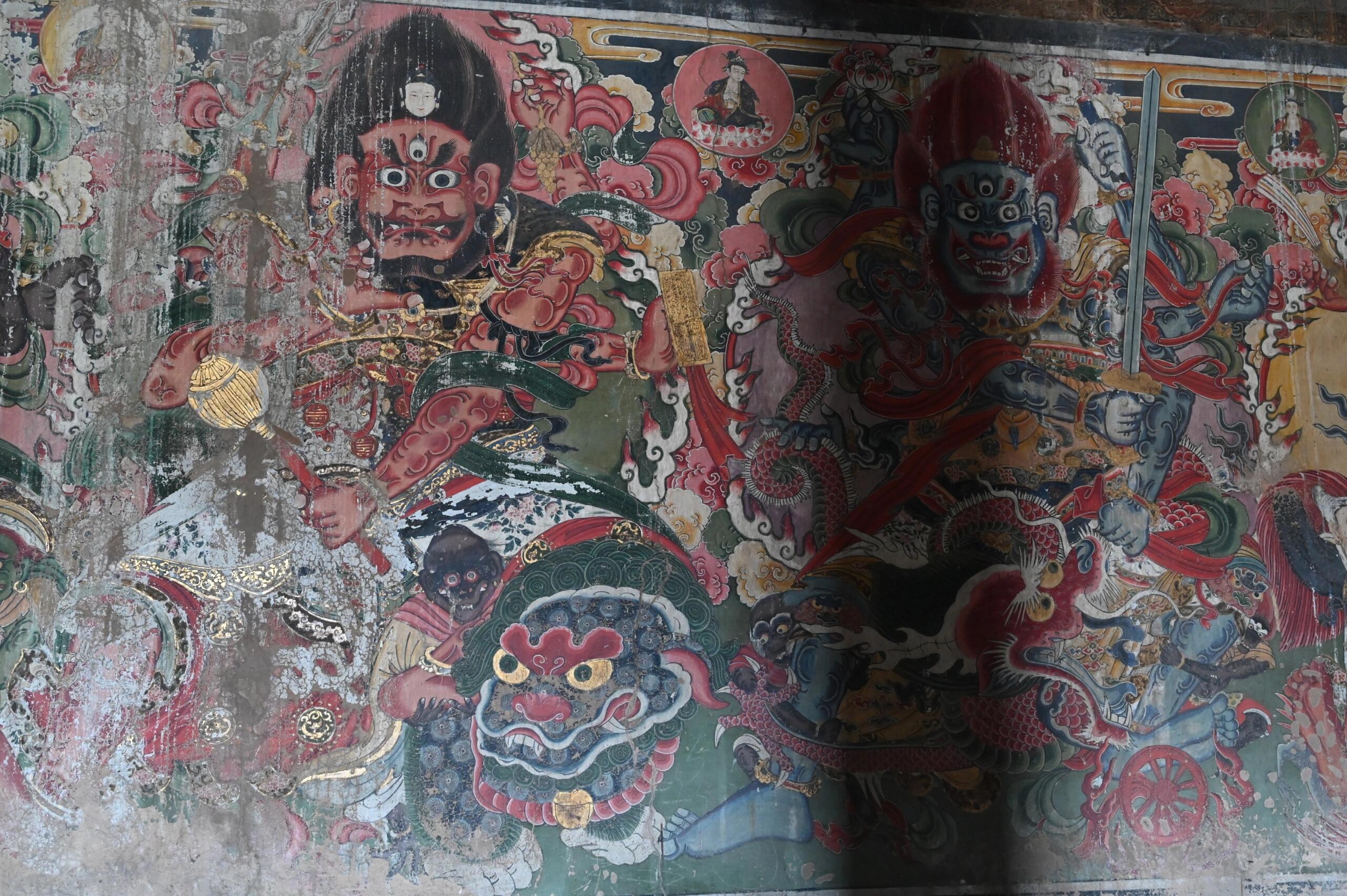 北壁上的十大明王像最为震撼。这些护法神祇身形高大,超过常人比例,神态奇诡怪诞,笔法遒劲有力。他们或怒目圆睁,或獠牙外露,骑乘神兽,手持法器,周身环绕着火焰般的笔触,威严之气扑面而来。明王身后的祥云与火焰,被画师用浓重的色彩勾勒,仿佛能感受到炽热的气息在殿内蒸腾。