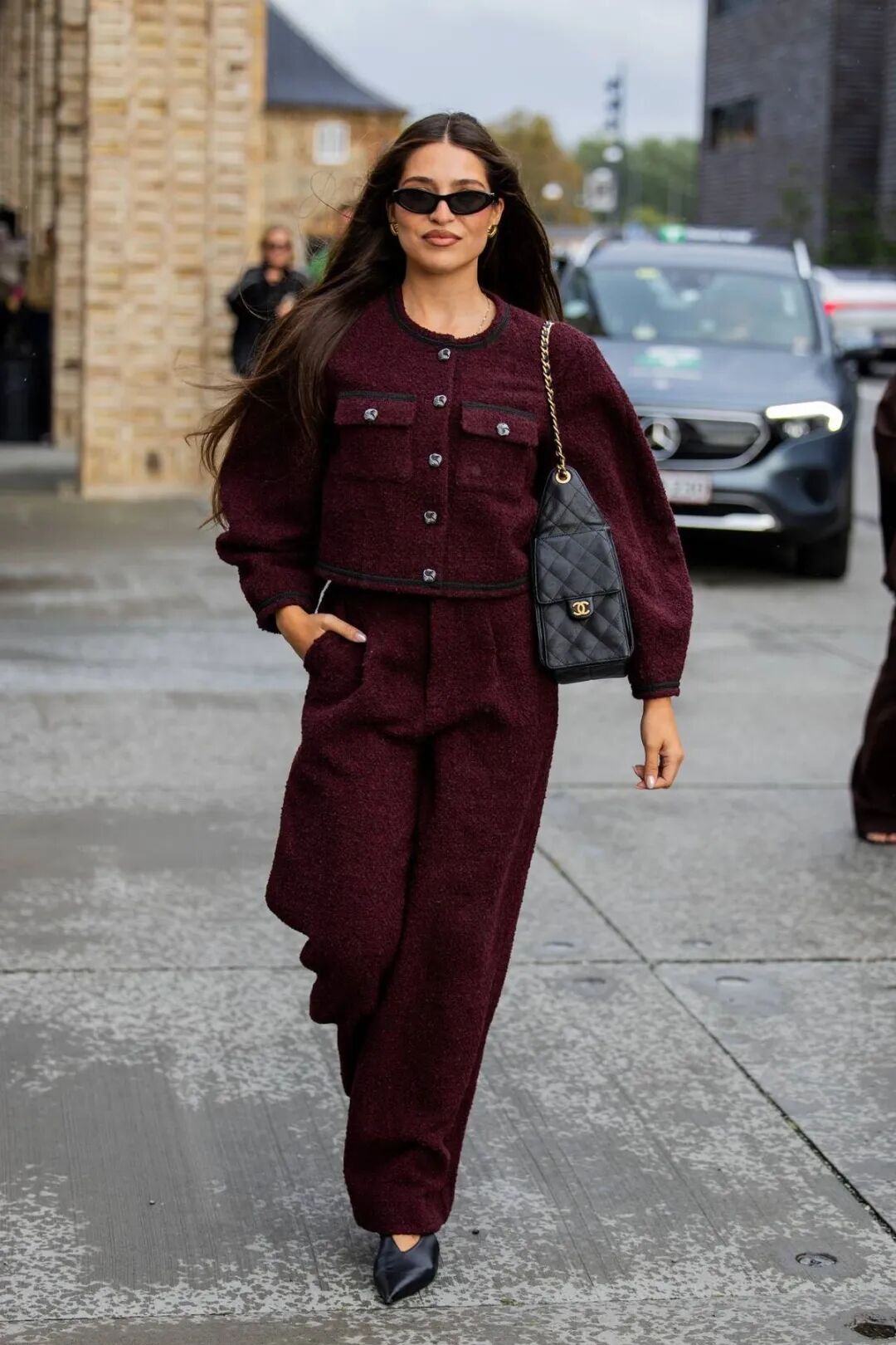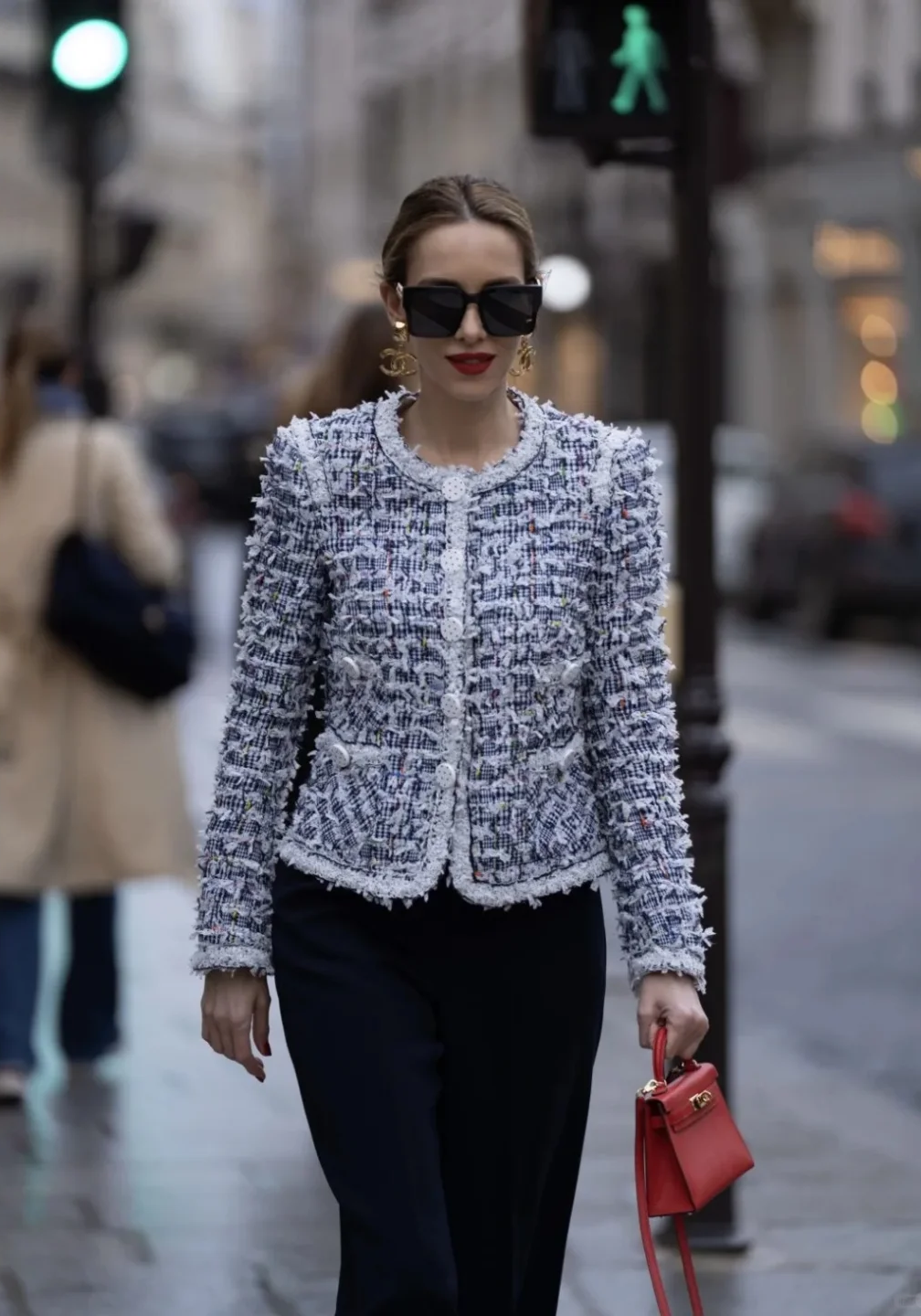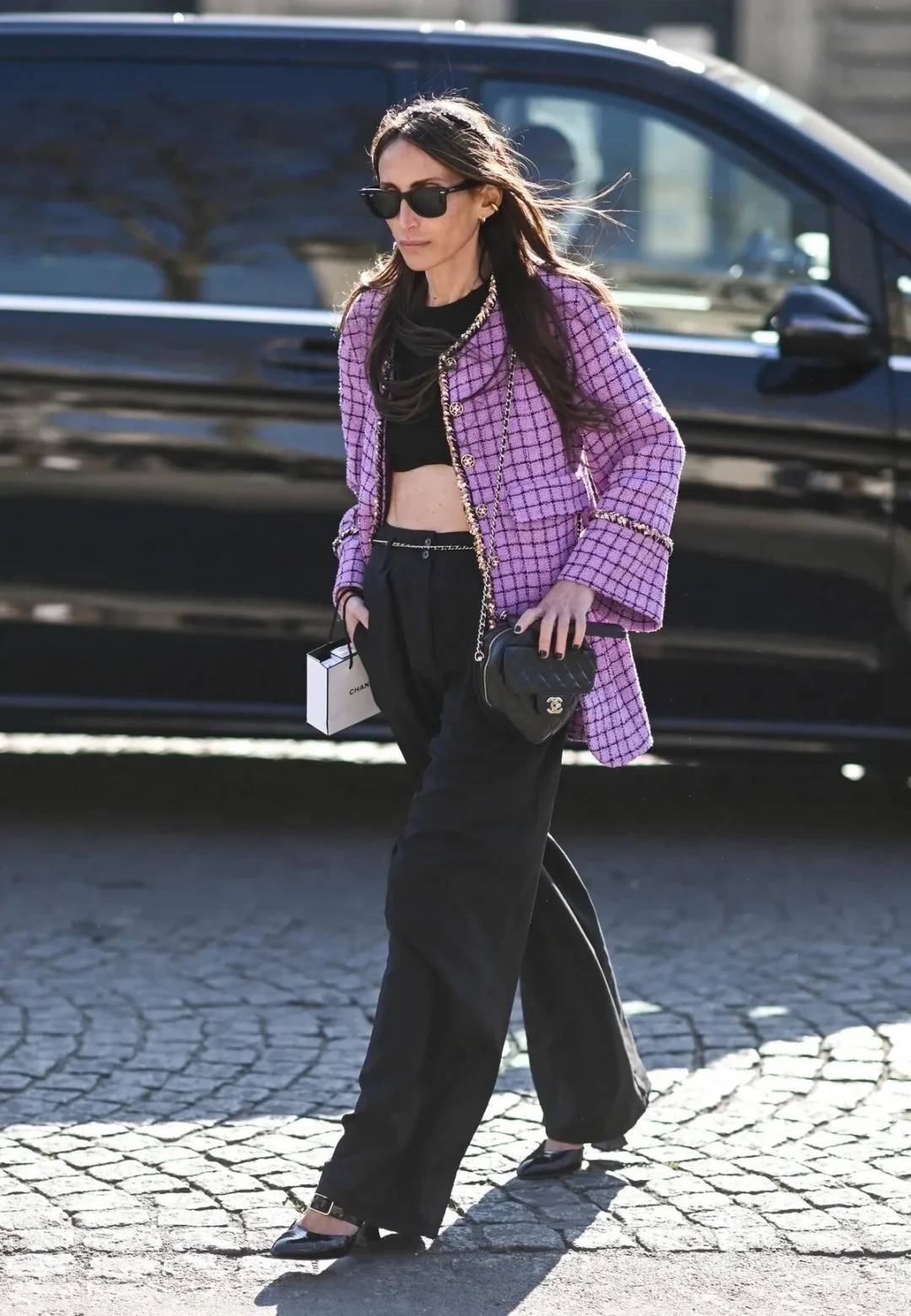 小香风的细密织纹避免了整体过于硬朗,西装阔腿裤的挺括廓形又平衡了小香风的柔美,一柔一刚的结合,让造型既有精致感,又带着清晰的理性气质,利落不拖沓。