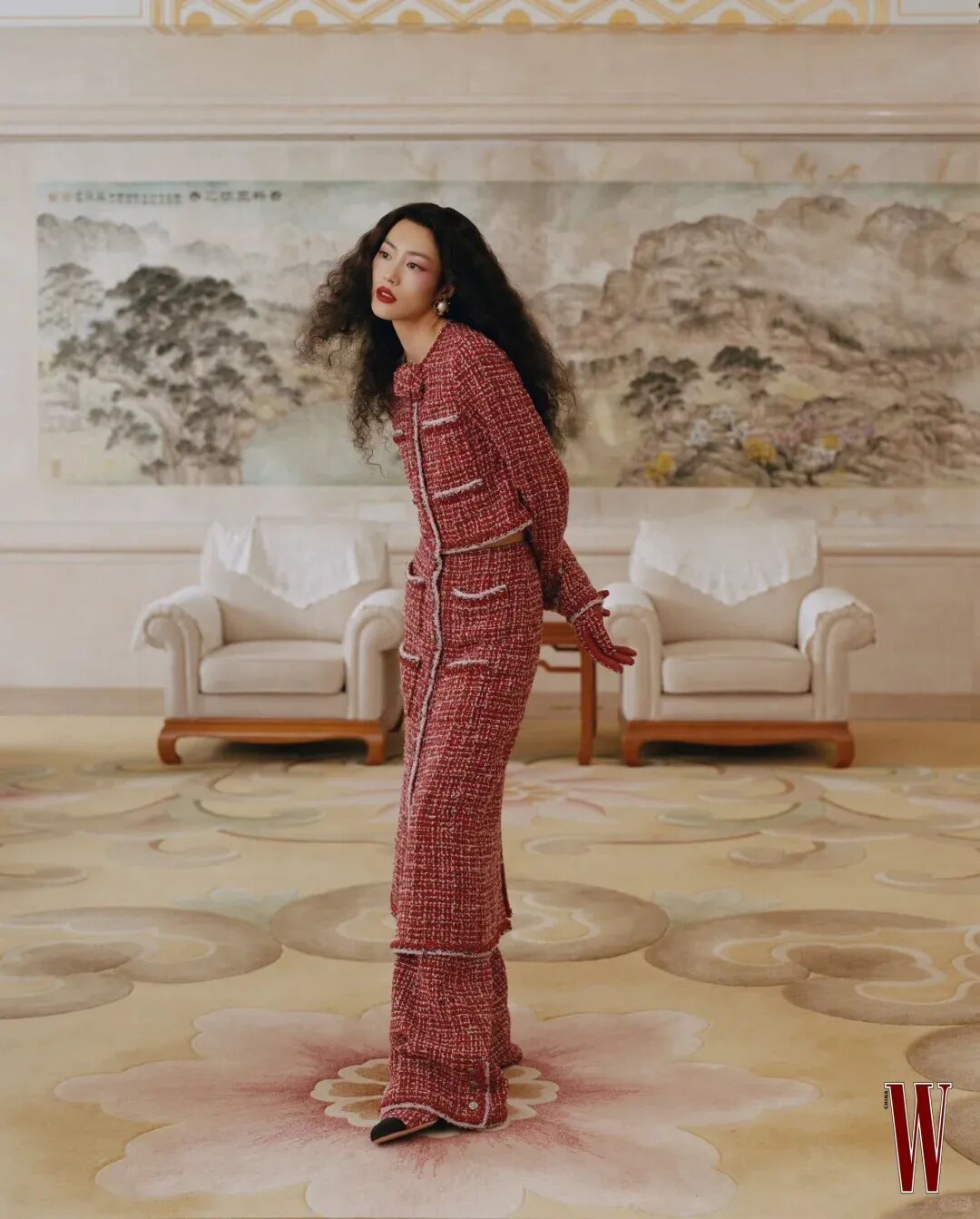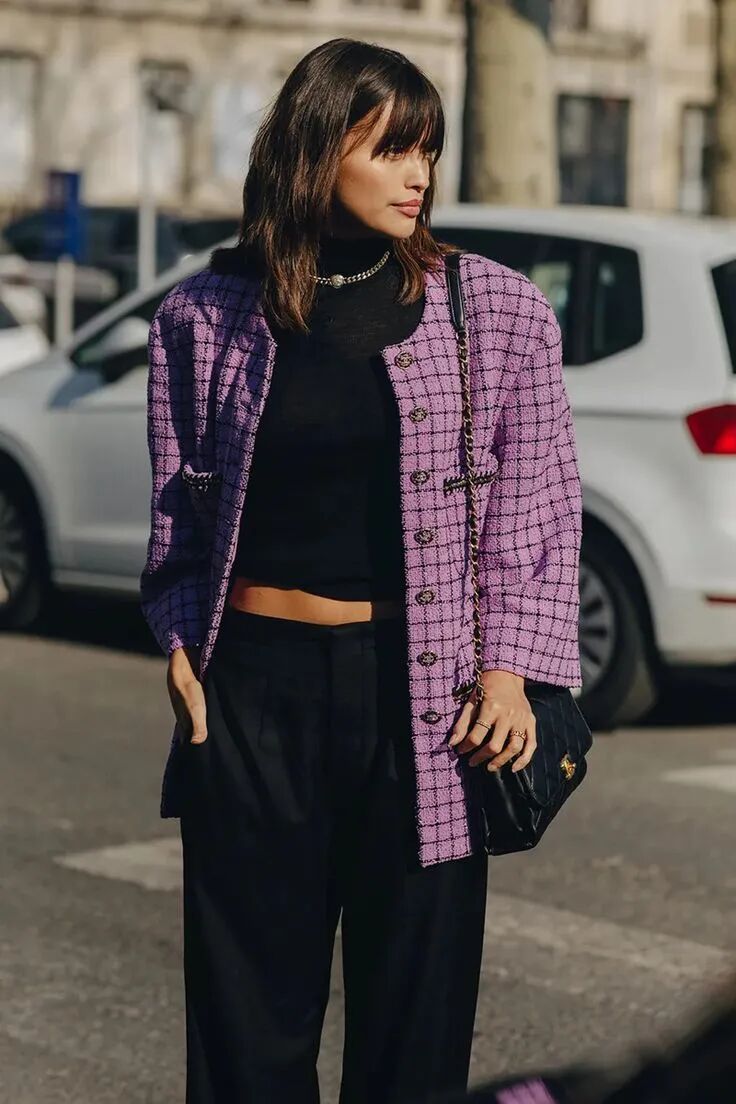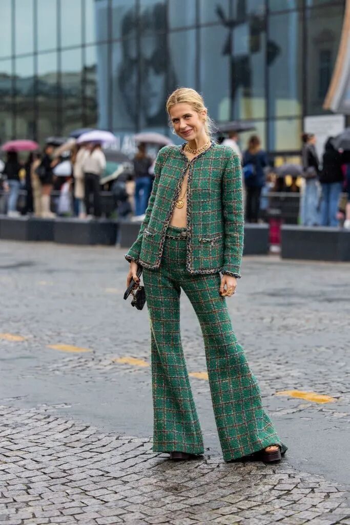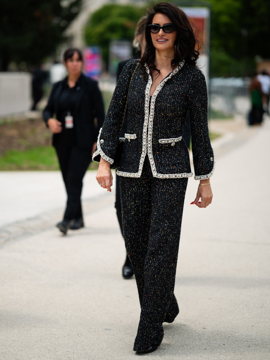 小香风的细密织纹避免了整体过于硬朗,西装阔腿裤的挺括廓形又平衡了小香风的柔美,一柔一刚的结合,让造型既有精致感,又带着清晰的理性气质,利落不拖沓。