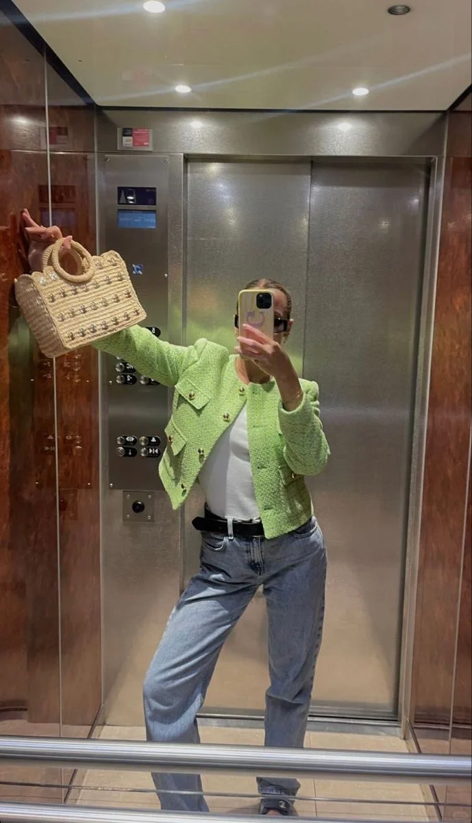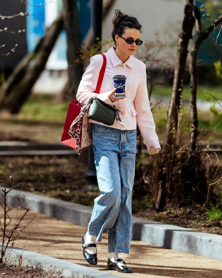 纯色小香风外套的精致,遇上浅蓝牛仔裤的随性,两者在质感和色调上的自然碰撞,已经能营造出丰富的层次,无需额外添加复杂元素,就能穿出利落又有品味的感觉。