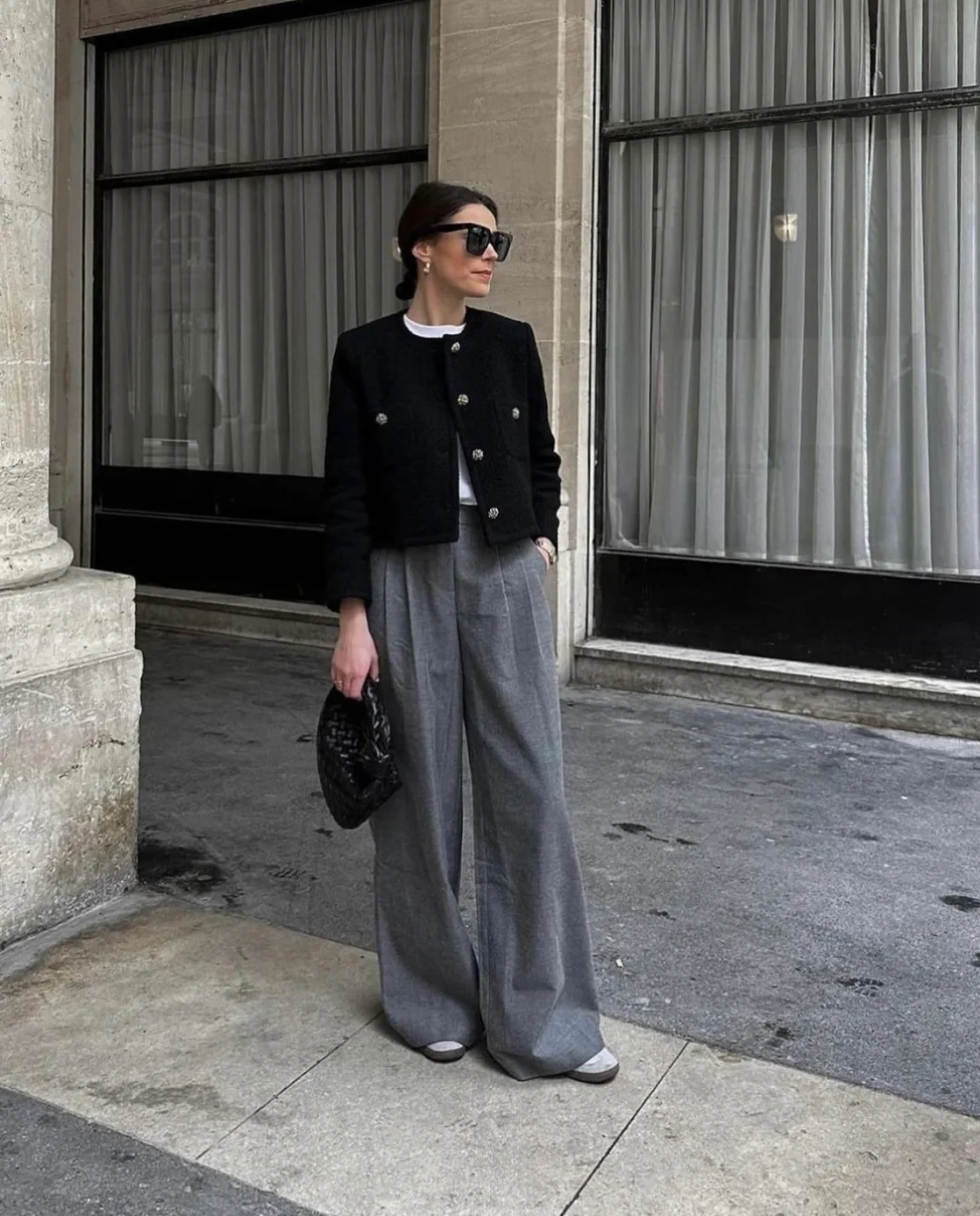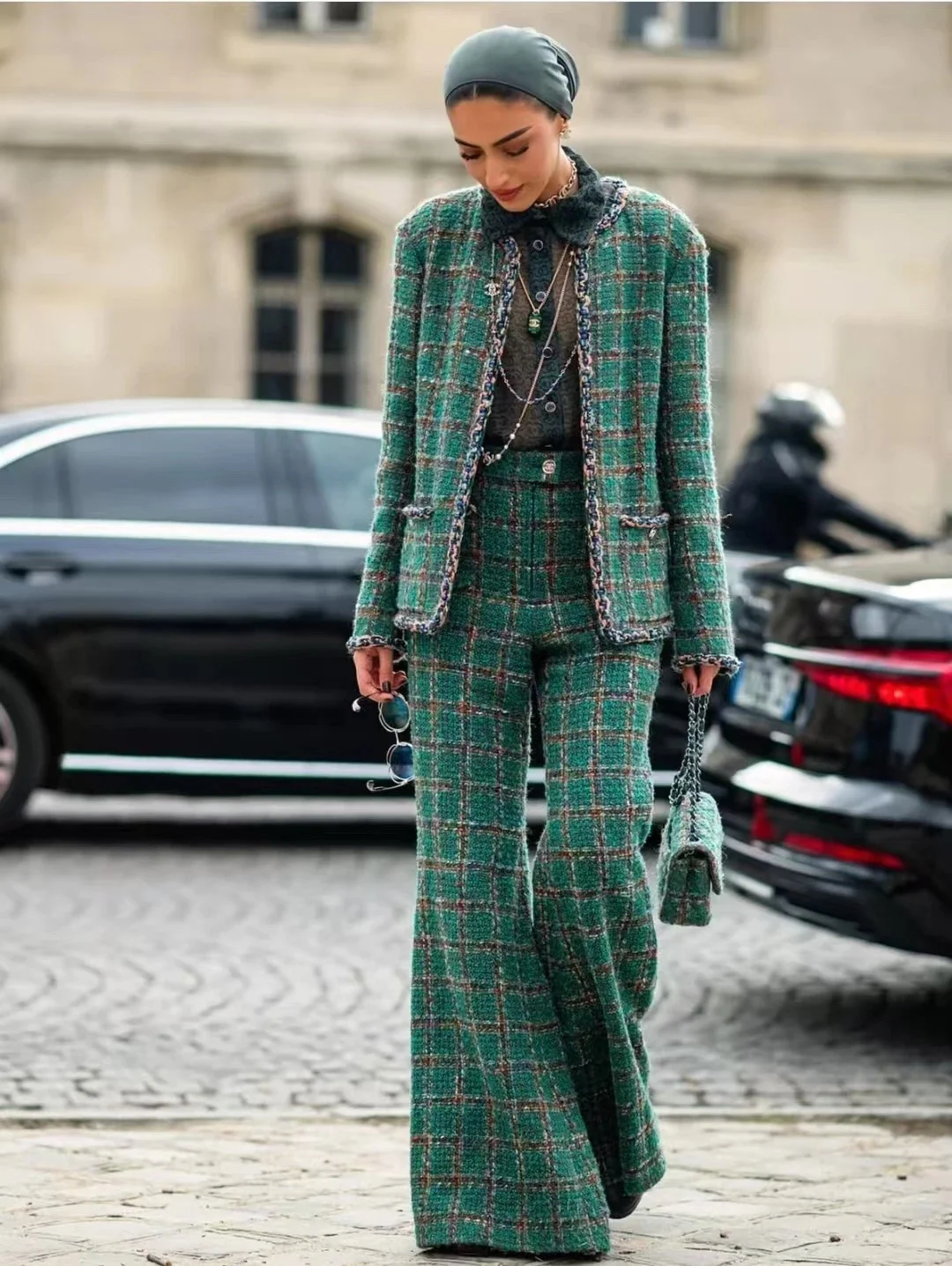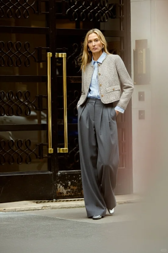 小香风外套的精致遇上阔腿裤的舒展,不是风格的冲突,而是互补的圆满。