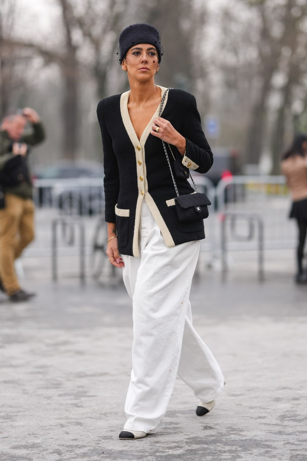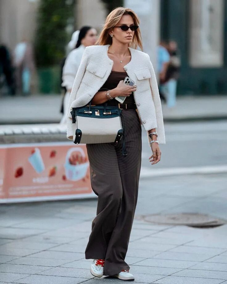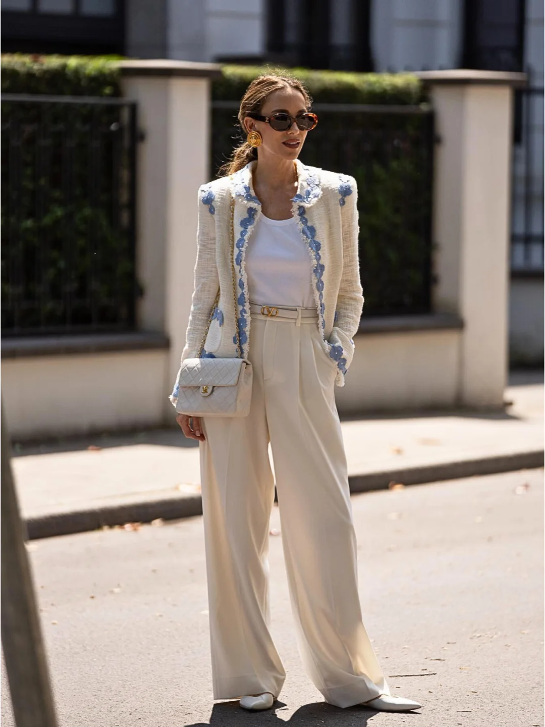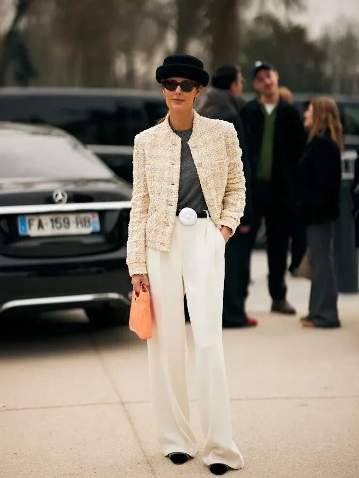 想让小香风外套 + 白色阔腿裤显利落,选对裤型是关键。