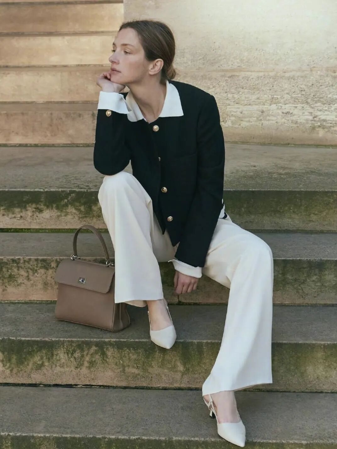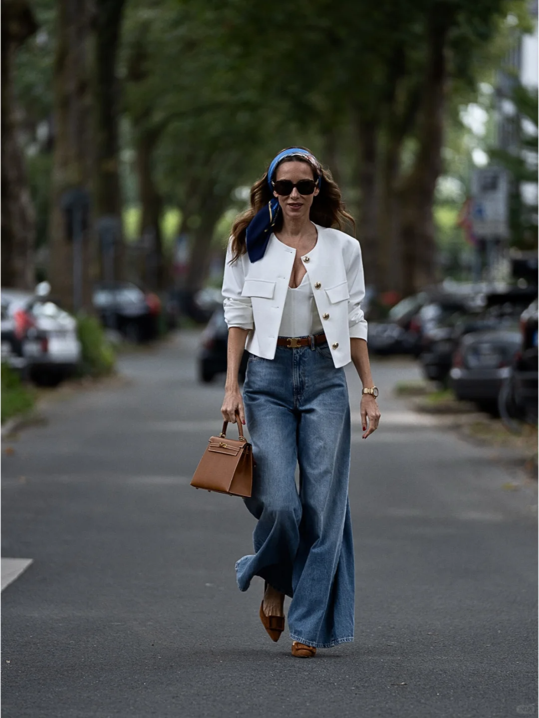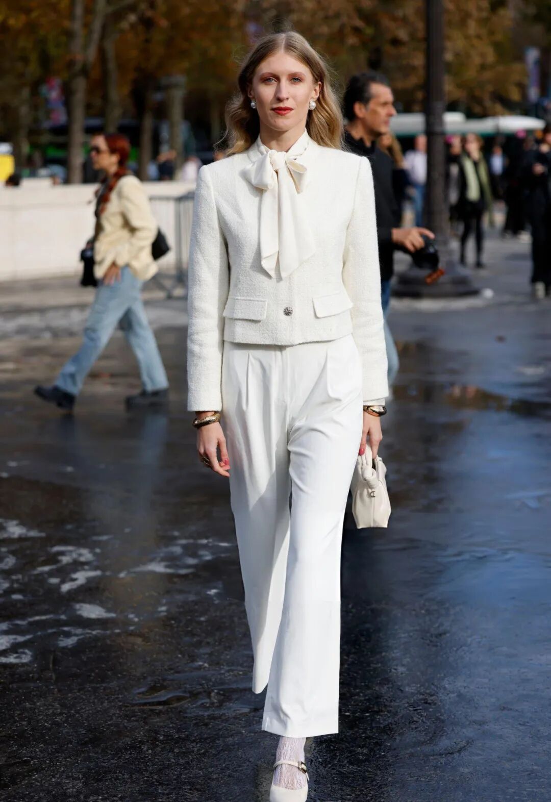 想让小香风外套 + 白色阔腿裤显利落,选对裤型是关键。