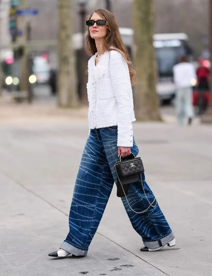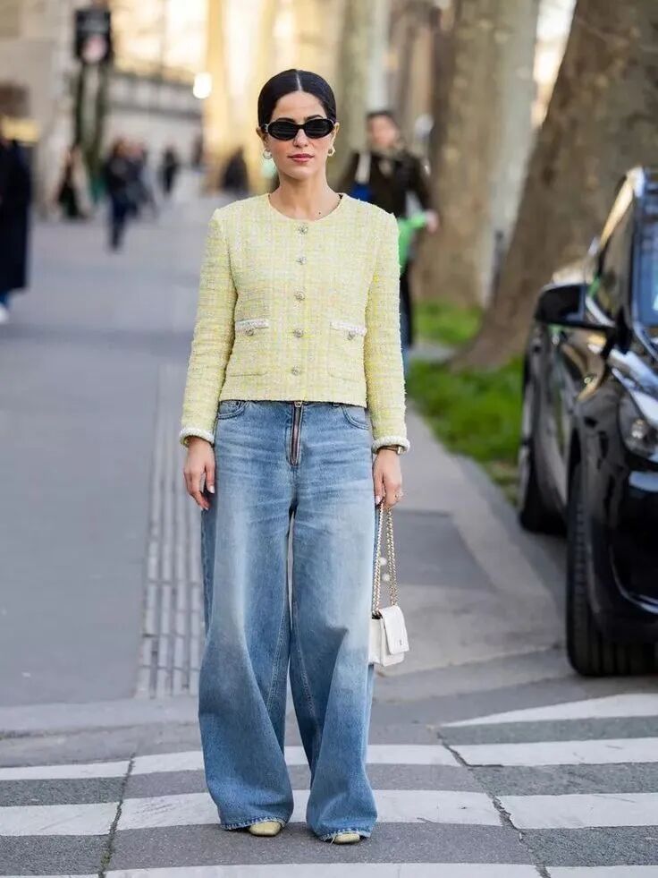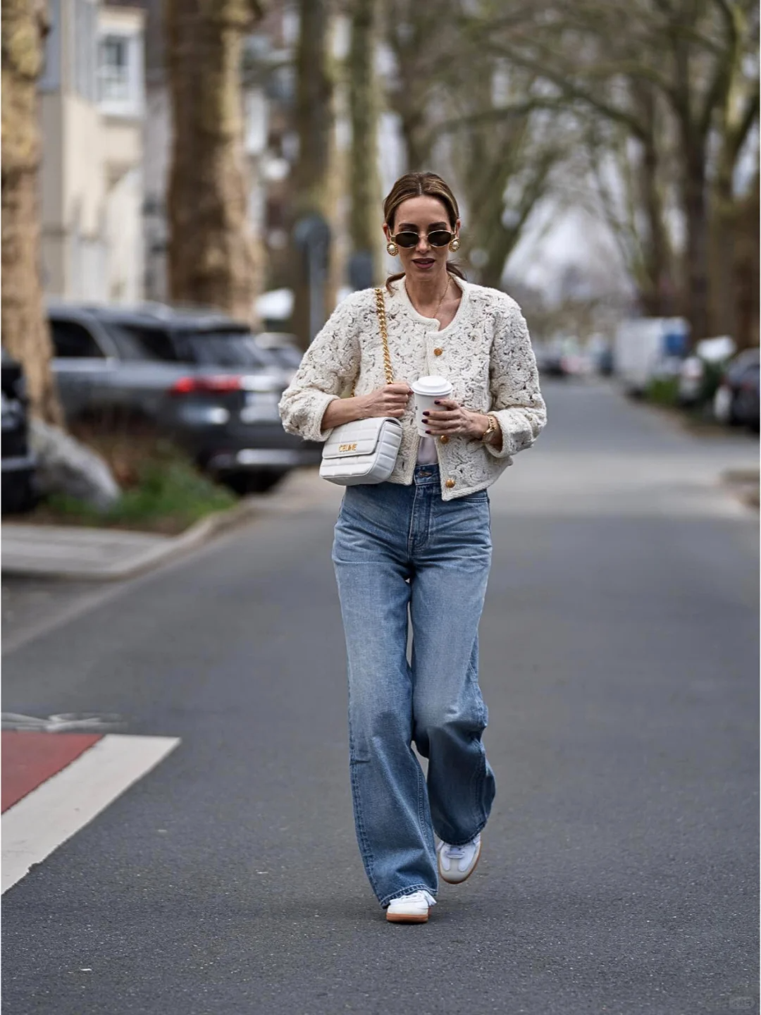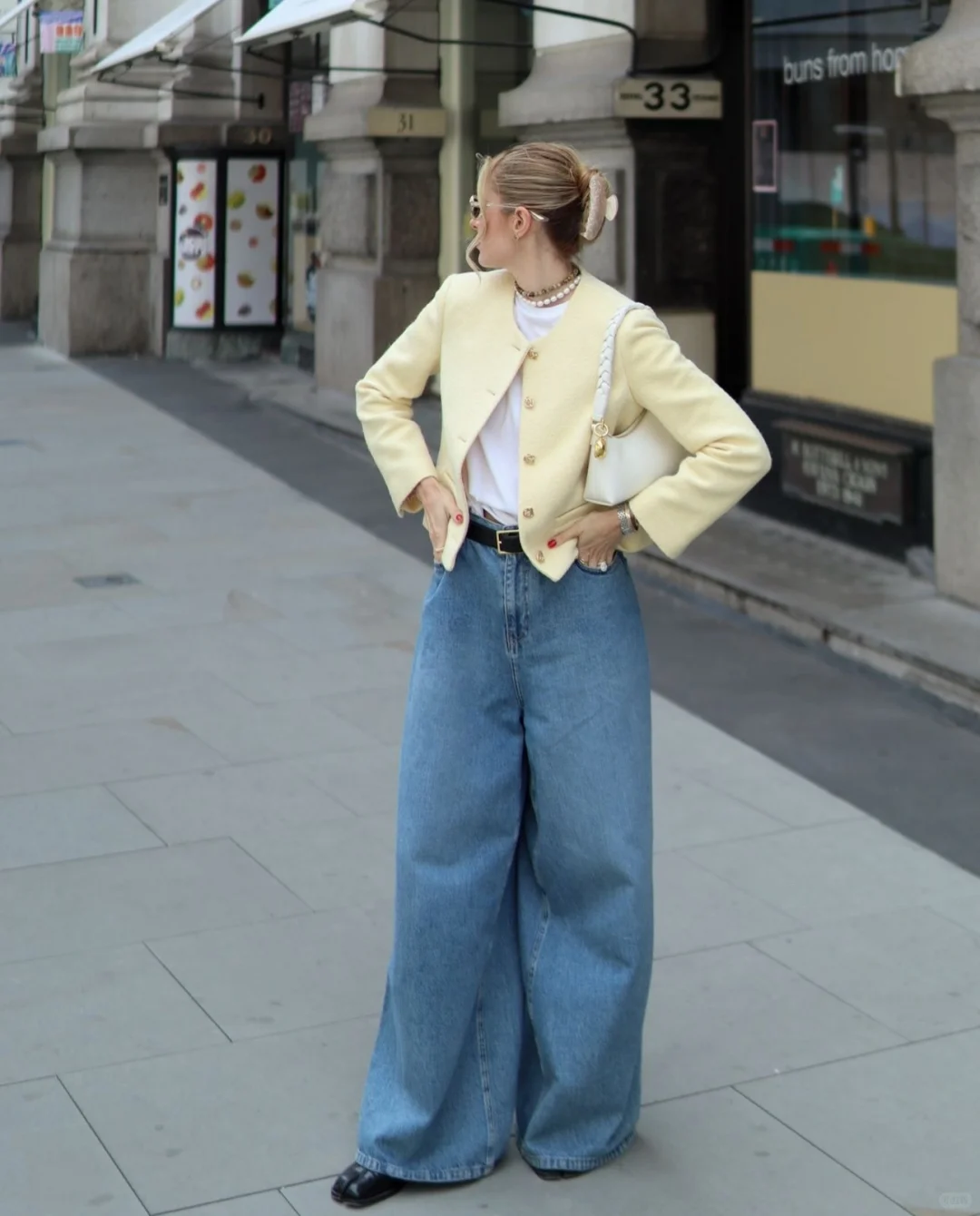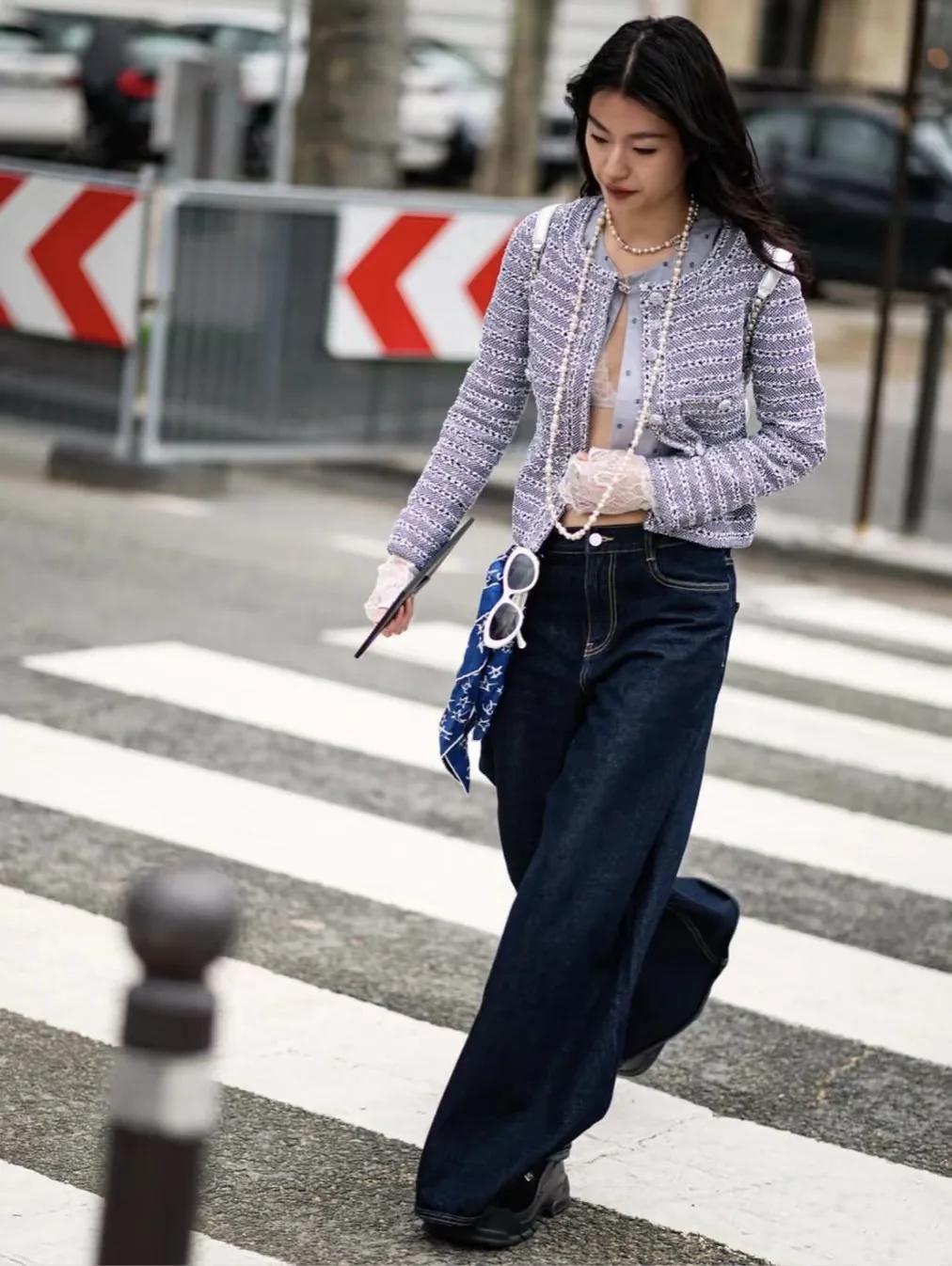 这组搭配藏着双向的风格升级:牛仔裤的不羁打破了小香风的刻板,激发出它自由叛逆的内核;小香风的优雅又中和了牛仔的粗犷,让阔腿裤多了几分精致质感,两者互补又平衡。