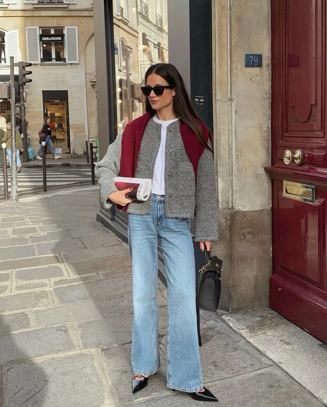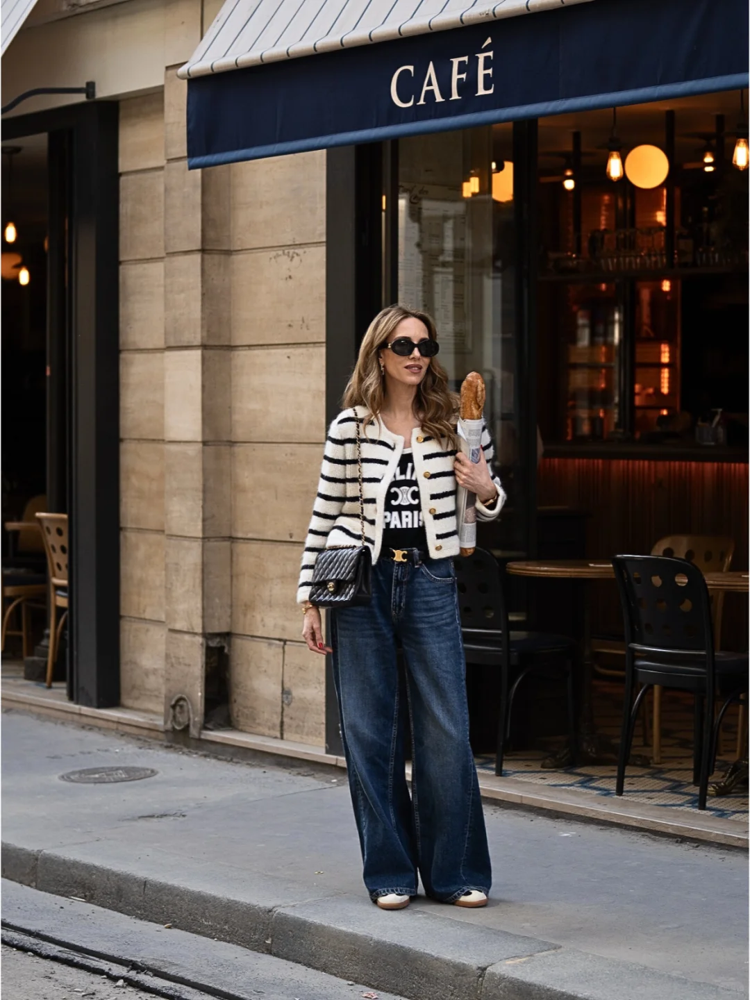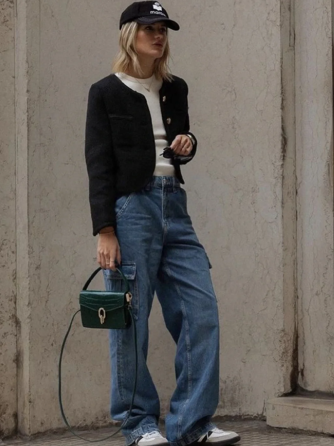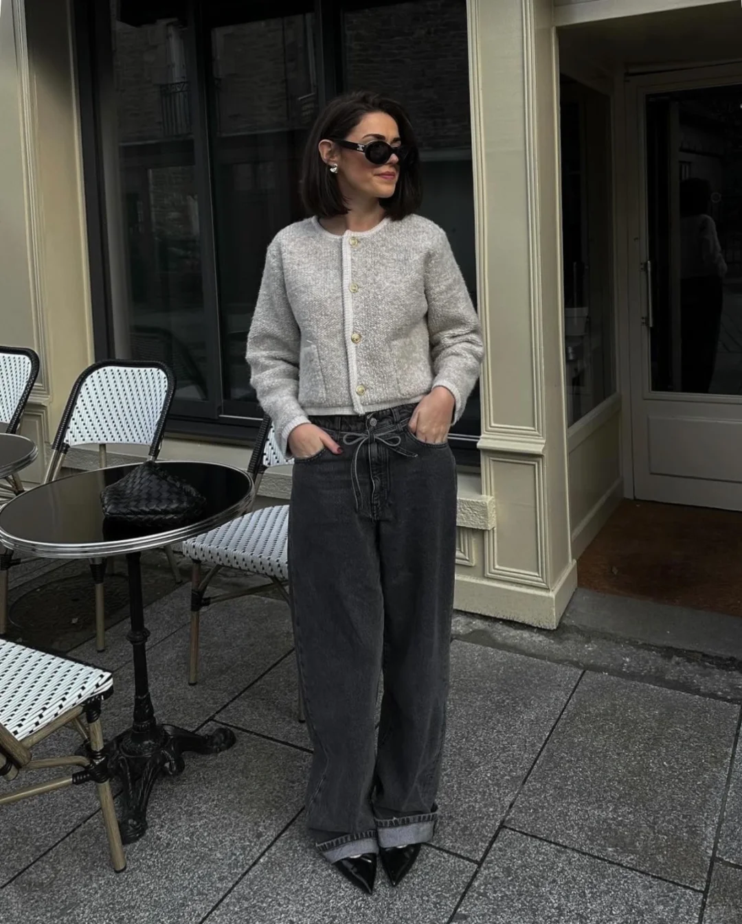 这组搭配藏着双向的风格升级:牛仔裤的不羁打破了小香风的刻板,激发出它自由叛逆的内核;小香风的优雅又中和了牛仔的粗犷,让阔腿裤多了几分精致质感,两者互补又平衡。