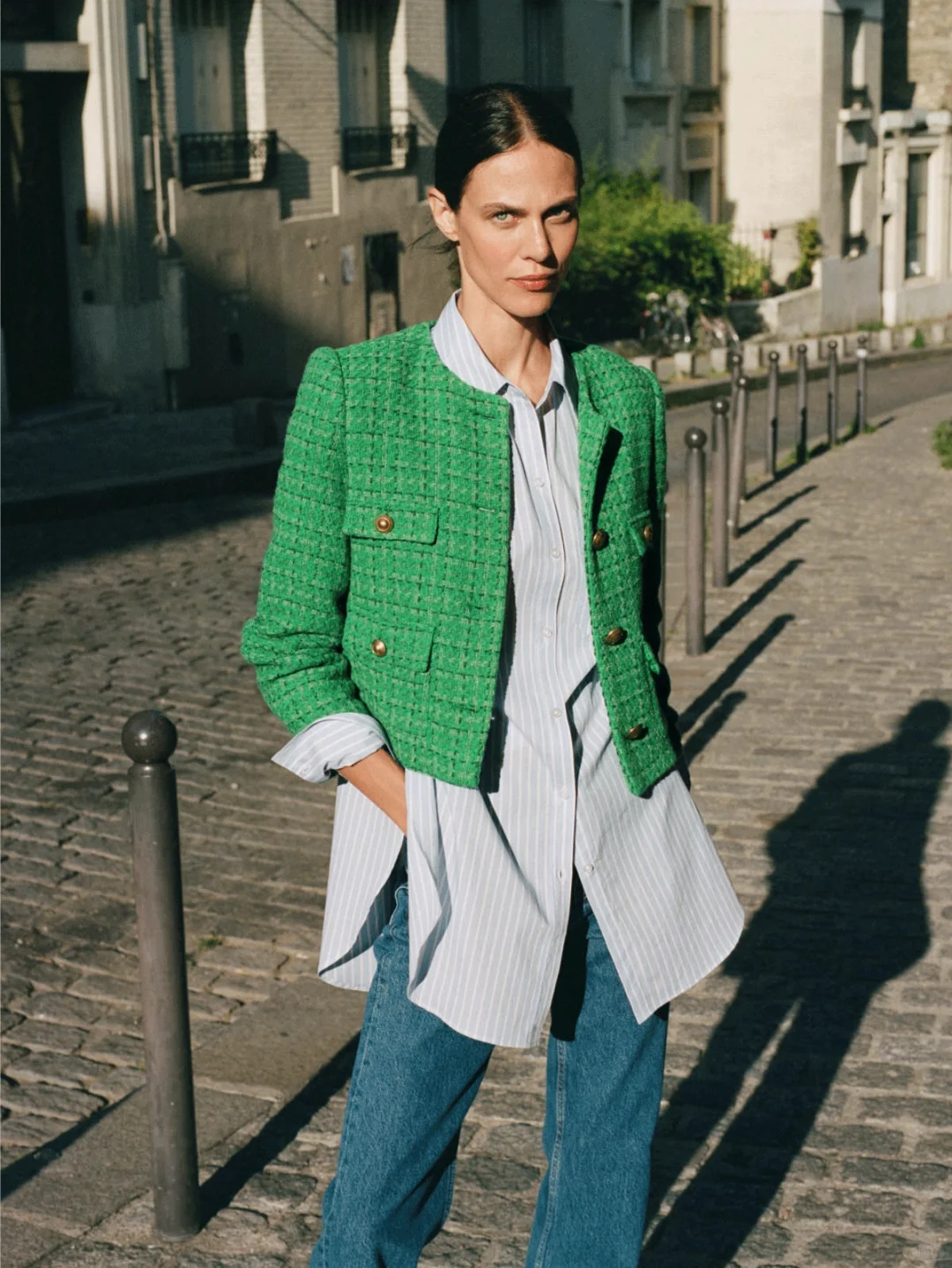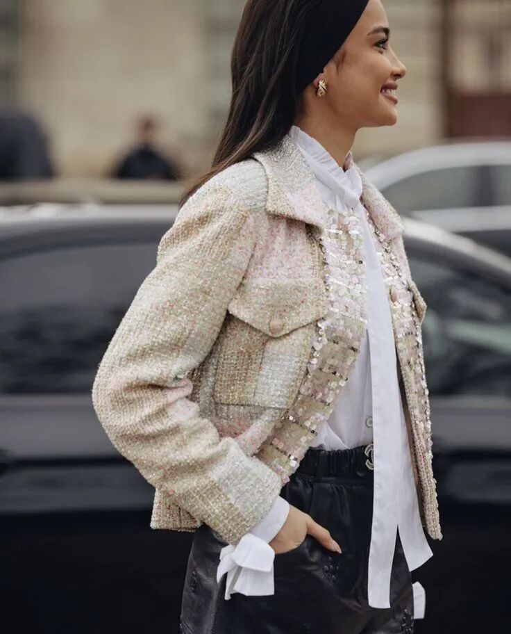选小香风外套时,优先 pick 长度不超臀部的款式。