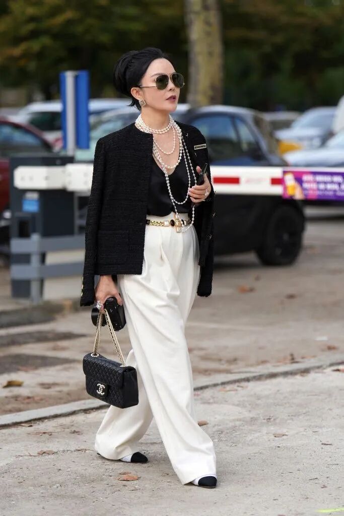 穿上小香风外套,再配白色阔腿裤,“上紧下宽” 的对比特别明显。