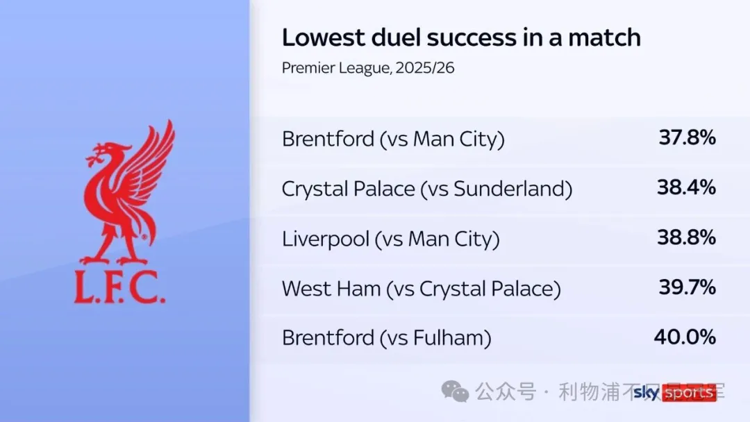 1:本场利物浦只赢得了38.8%的对抗,创造了本赛季英超所有比赛第三低的对抗成功率。