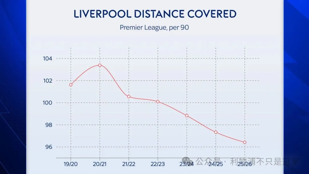 当然这里要强调,这不是斯洛特到来以后才有的趋势。统计数据表明,自2021-22赛季至今的最近5个赛季,利物浦在跑动距离方面呈现连年下降趋势,包括渣叔的最后3个赛季。