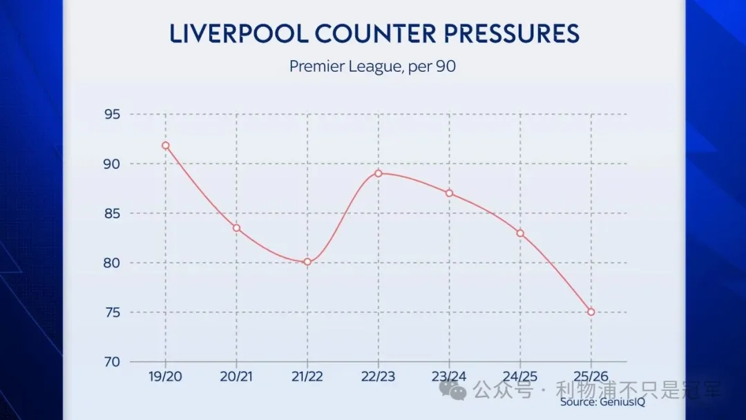 上赛季利物浦的逼抢次数超过此前5个赛季,但本赛季却急剧下滑到7个赛季以来的最低值。