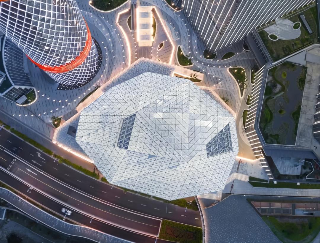 而紧挨着的长滩音乐厅,拥有1,027个席位,设计取意“东海龙王水晶宫”。白天看,建筑像块棱角分明的水晶,到了晚上才真正“活”过来——灯光从无数孔洞透出,整座建筑如钻石般在夜色中发光。