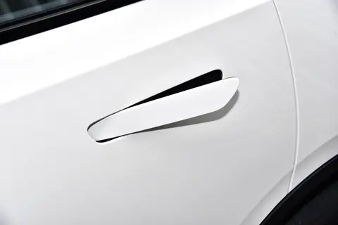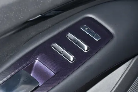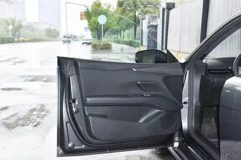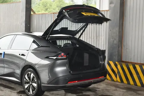 移步车侧,流畅的溜背线条是点睛之笔,勾勒出前低后高的俯冲姿态,视觉效果颇为协调。无框车门和隐藏式门把手这类提升格调的配置自然没有缺席。当我靠近车辆时,门把手自动弹出的那一刻,仪式感瞬间拉满。更值得一提的是一个贴心细节:当你拉开车门时,车窗玻璃会微微下降,关门后则紧密升起,确保了良好的密封性,也提升了使用质感。实拍车型装备的19英寸多辐轮圈,搭配尺寸可观的轮胎,让车身的“下盘”显得非常饱满稳重。